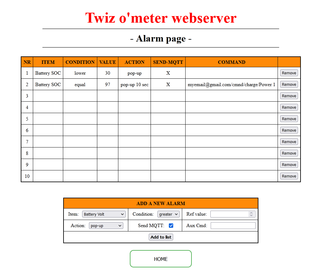 Today, I configured a Tasmota plug (MQTT and Wifi settings already done last week). Once the configuration done, I wanted to do a test (cut the load when SOC reaches 57%). So I opened the Webserver's Alarm Page to add a new alarm.