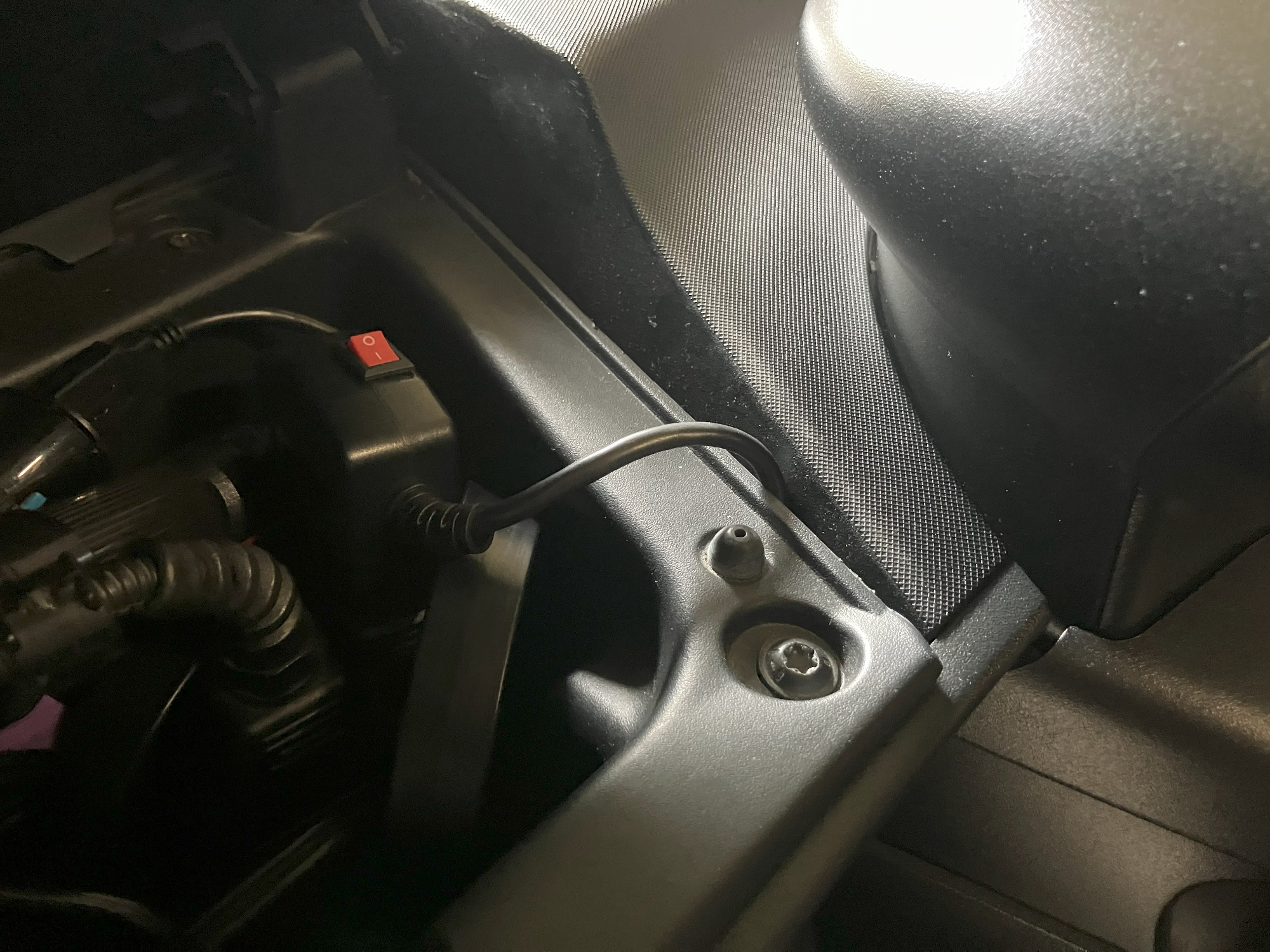 Das Kabel habe ich anschließend in das Handschuhfach geführt und durch die Öffnung das OBD-Steckers geführt, der jetzt mit dem Stecker des ToM unterhalb des Handschuhfaches liegt.