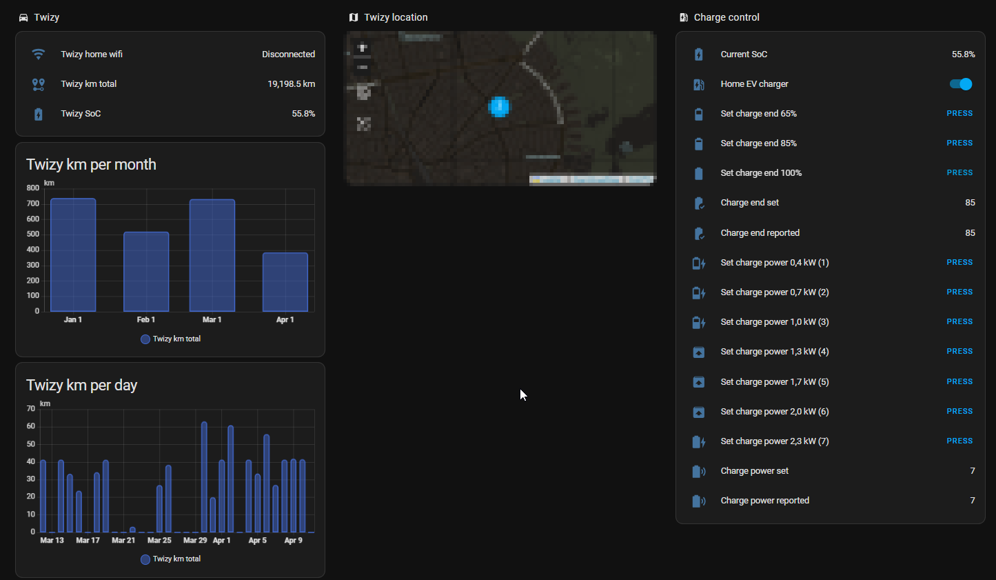 2020 Twizy 80 with Korea windows. I have a Twiz'O'meter which is connected to my Home Assistant. I have a type 2 adapter and a CEE adapter so I can charge everywhere. I can read and understand German pretty well, but I can't write it