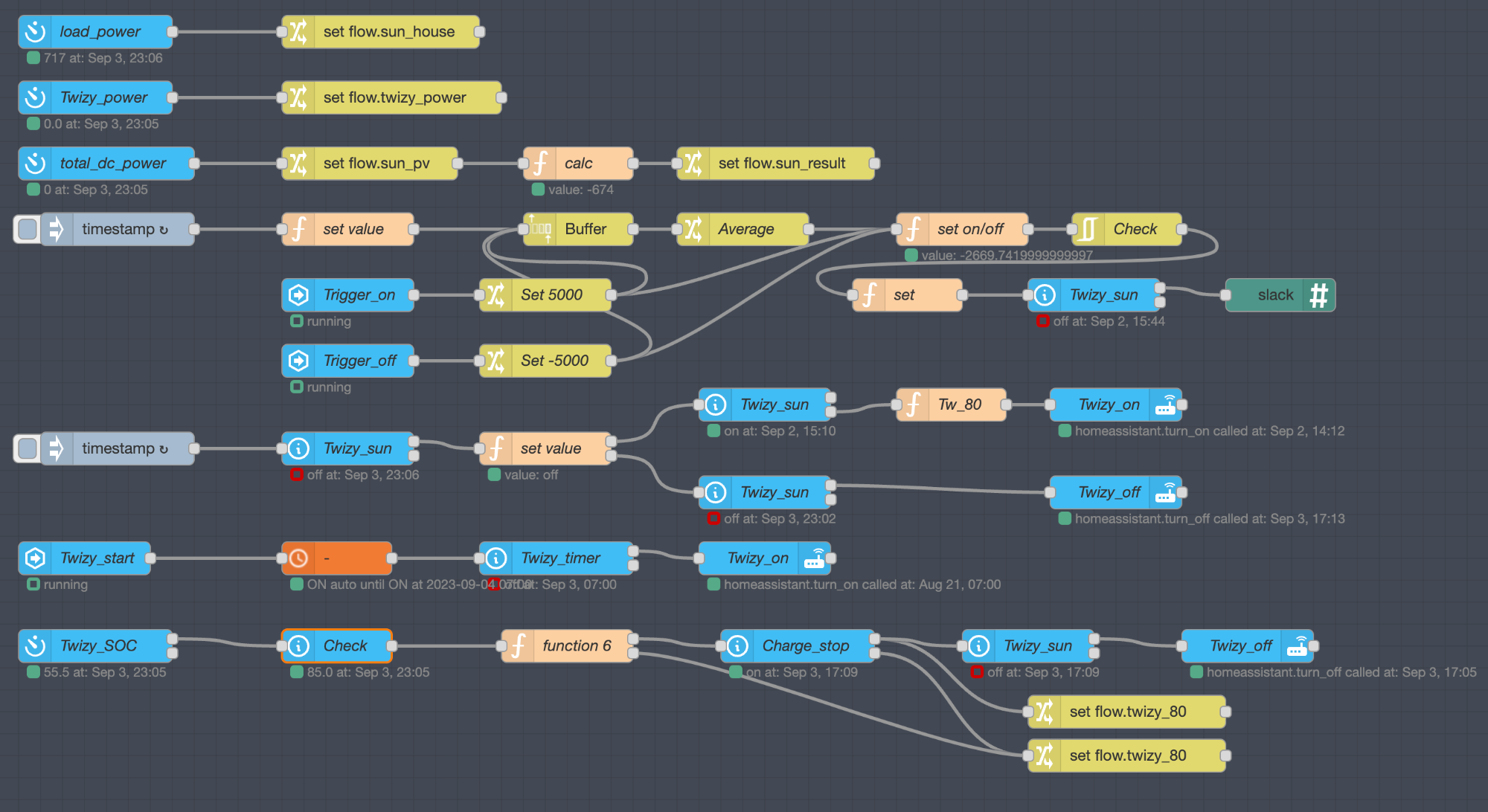 I would also like to share my setup. Many people use Home Assistant and Node-Red for home automation, and I do as well! I got my Twizy a month ago and the TwizOmeter last Friday, so this is just the beginning. My setup consists of a Nuc running Proxmox, with an LXC container hosting several Docker containers. I'm using Home Assistant for presentation and data collection, and Node-Red for automations, with Mosquitto for MQTT communication. I have solar cells on my house, so automation helps me make the most of the sun for my own usage.