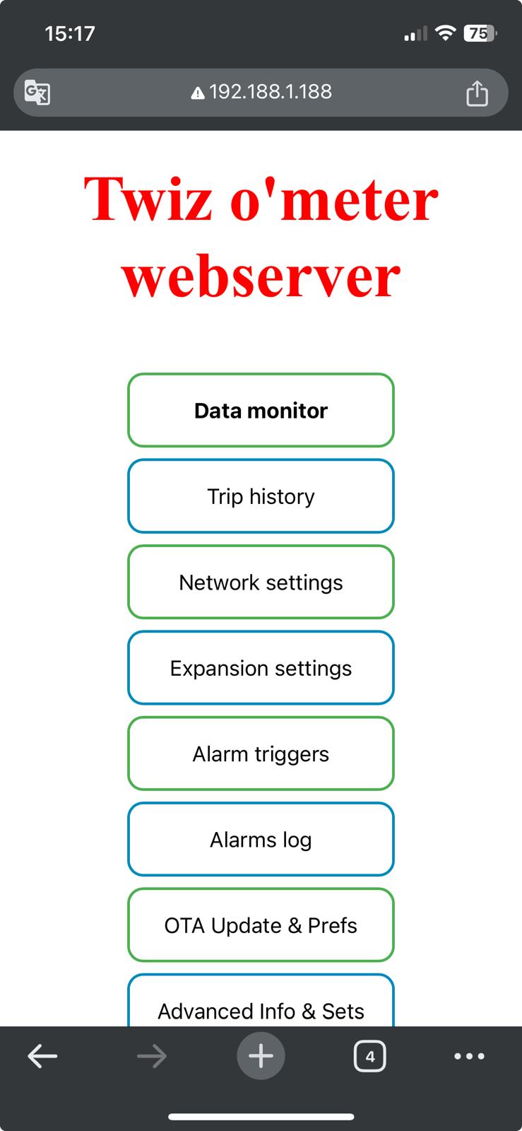 Webserver was also tested on iPhone (and on iOS laptop) while ToM was connected to an Android hotspot or home WiFi and it works as expected. In this case iPhone (or laptop) and ToM are on the same network even if it's not the iPhone private hotspot. So, since your phone isn't connected to "Twiz O Meter AP", you will have to enter on the browser ToM network IP. You can find this IP on the WiFi settings page on your ToM display. As shown in the image this time its IP was 192.168.43.202 instead of 192.188.1.188, and it works fine as well.