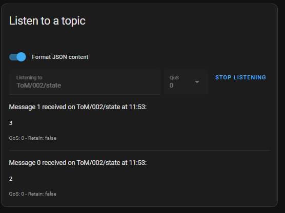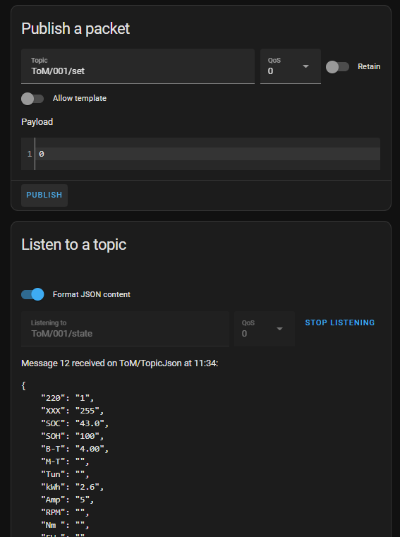 This is within Home Assistant, I have installed the MQTT addon. On the bottom you can see the last packet of the topic ToM/TopicJson, so listening to packets works fine. However, as you can see I send a 0 to the topic ToM/001/set, which should stop the charging process, correct?