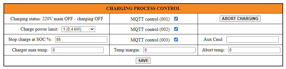 "ToM/001/set" for abort charging. Payload: "0" (to abort) or "1"