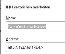 - Manchmal hat der Webserver Probleme beim Laden. In diesem Fall ist es hilfreich, Ihr Twiz o'meter mit einem Wi-Fi-Netzwerk zu verbinden (oder mit dem Hotspot Ihres Telefons, wenn Ihr Wi-Fi-Netzwerk nicht in Reichweite ist), bevor Sie versuchen, die Hauptseite des Webservers zu laden.