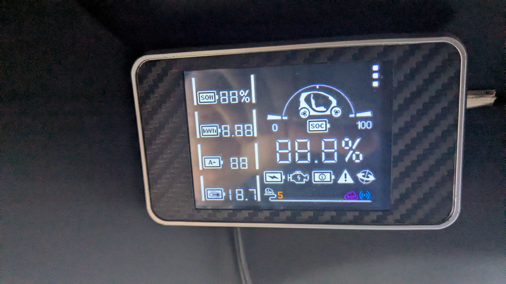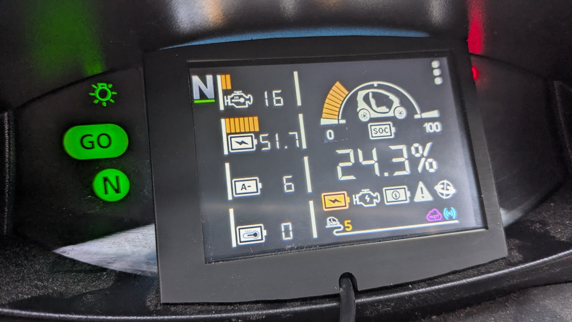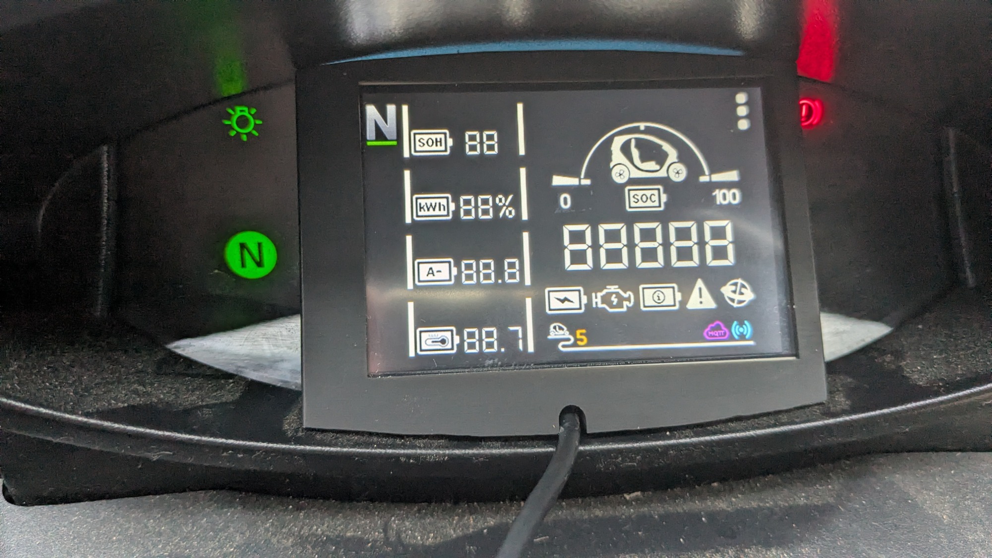 [edit] One thing that caught my eye: the battery temp is displayed at 0C. I don't think that's true. The outside temperature here is around 7C today, so I'd expect the battery to be around that temperature. Certainly not 0C. Motor temp seems to be on the high side. Batt voltage and current seem plausible. Batt current also changes if I switch on the high beams, for instance.