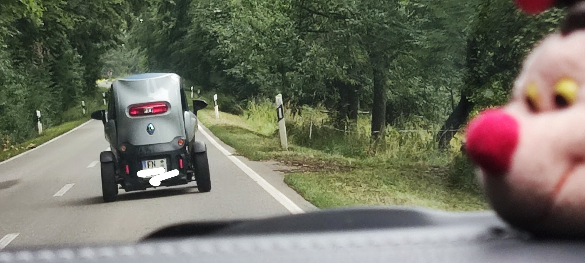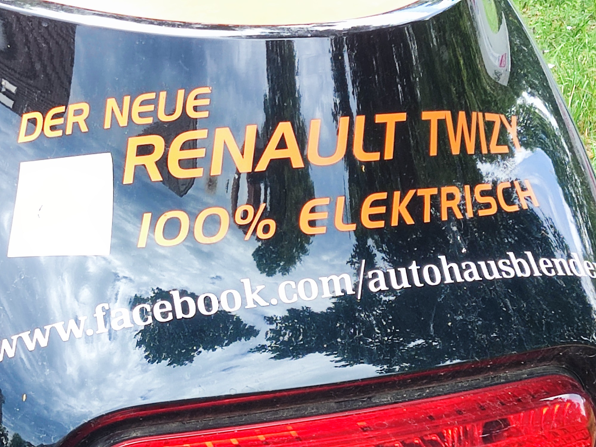 Schwarzer Twizy mit hellblau eingefärbtem Renault Frontlogo kam mir wieder mal entgegen. Sehe dieses Exemplar öfters mal lokal zu den Pendler-Stosszeiten.