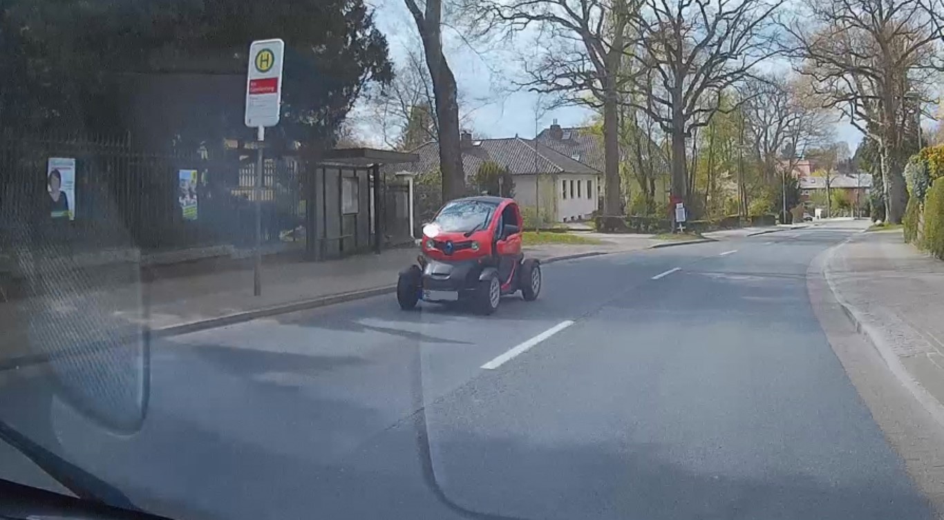 Heute Mittag gegen 12:50 Uhr (?) aufm Weg zur Arbeit, der salsa-rote Twizy, den ich schon oft sah und hier berichtete, überholt mich kurz nach dem "Karlstor" und war dann einige Autos vorne dran - nach der SRH mal geschmeidig daran vorbei geglitten, kurz drauf eh rote Ampel "Servus!"