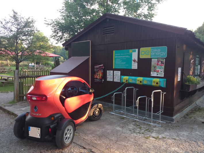 Dort gibt es drei 220 Volt Steckdosen eigentlich für eBikes. Waren aber alle frei und über Schotter zugänglich für unseren Twuffi. Noch kurz gefragt, ob wir laden dürften, was mit "Na klar, endlich nutzt das mal jemand" freudig erlaubt wurde. Sehr empfehlenswert. Strom und gutes Essen in einem schönen Biergarten.