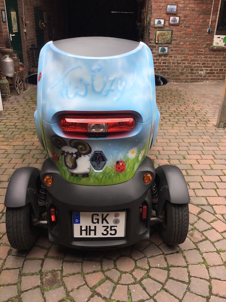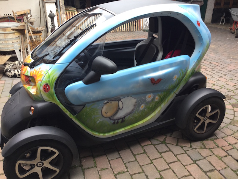mein Schwager aus Fürth mit dem Milky-Twizy hat mich ja schon angekündigt. Jetzt habe ich endlich auch einen Twizy. Ursprünglich war er schwarz, aber ich wollte ihn von Anfang an bemalen lassen. Und da ich auf einem kleinen Bauernhof lebe mit Schafen, Ziegen und anderem Getier, stand das Motiv von Anfang an fest.