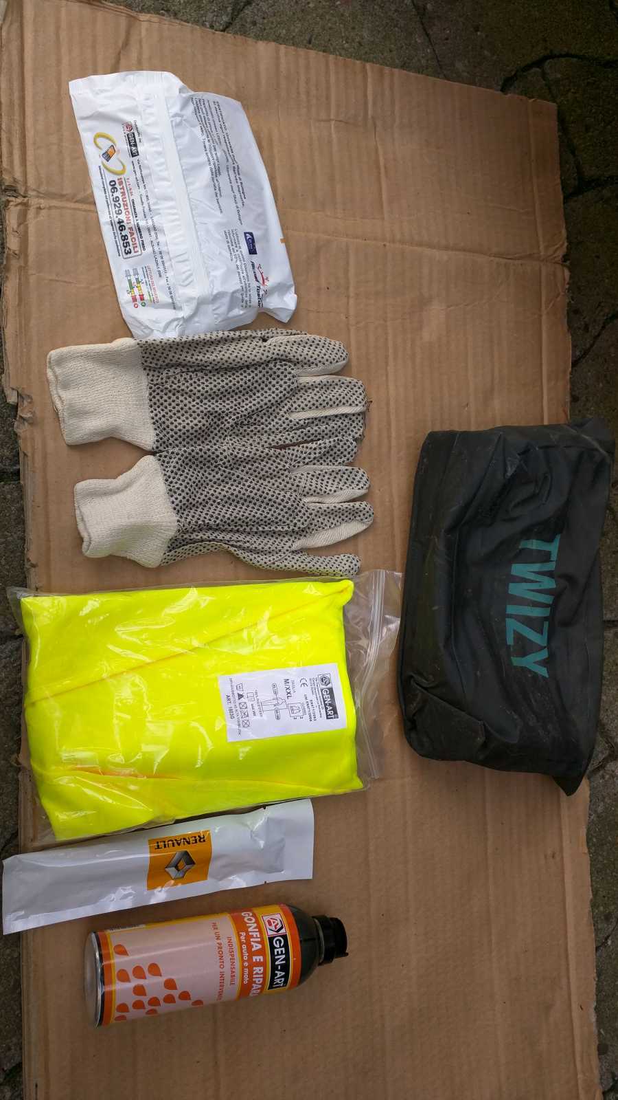 Eine Tasche mit der Aufschrift 'Twizy' mit folgendem Inhalt: