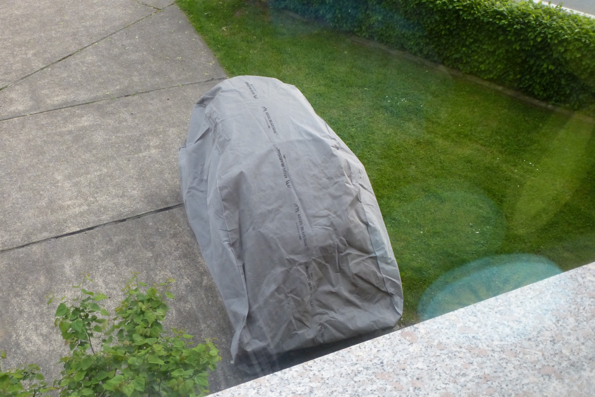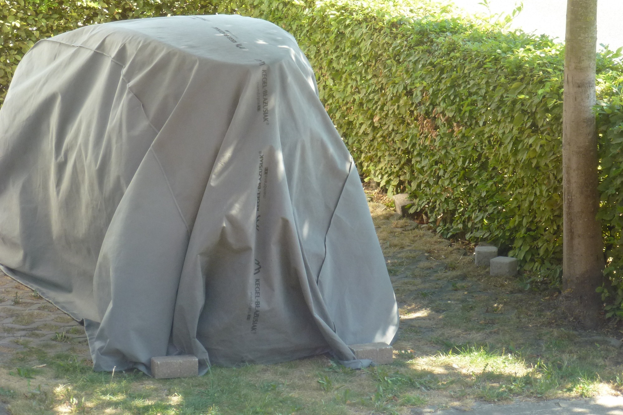 Hatte auf den Ecken 15kg-Gewichtheberscheiben. Da die Hülle, wie man sieht, nicht ganz auf Kante genäht ist, ziehts der Sturm einfach weg.