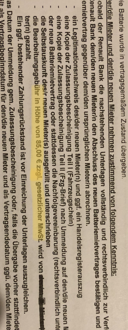 das ist ein deutscher Vertrag. Wie geschrieben, kann es sein, dass es noch mehr Seiten gibt. Ich habe nur diese beiden Seiten und noch eine Menge Seiten wegen der Assistance-Versicherung. Vermutlich hatte der Vorbesitzer das auch diese Kosten noch übernommen. Damit hat der Vorbesitzer allein an Renault für Reparaturen usw. dieses Jahr ohne den Twizy nutzen zu können, weil er die Werkstatt nicht verlassen konnte ca. 470 € mehr gezahlt, als er von mir für den Twizy bekommen hat. Für ihn war das Ende mit Schrecken wohl trotzdem die bessere Alternative zum Schrecken ohne Ende.