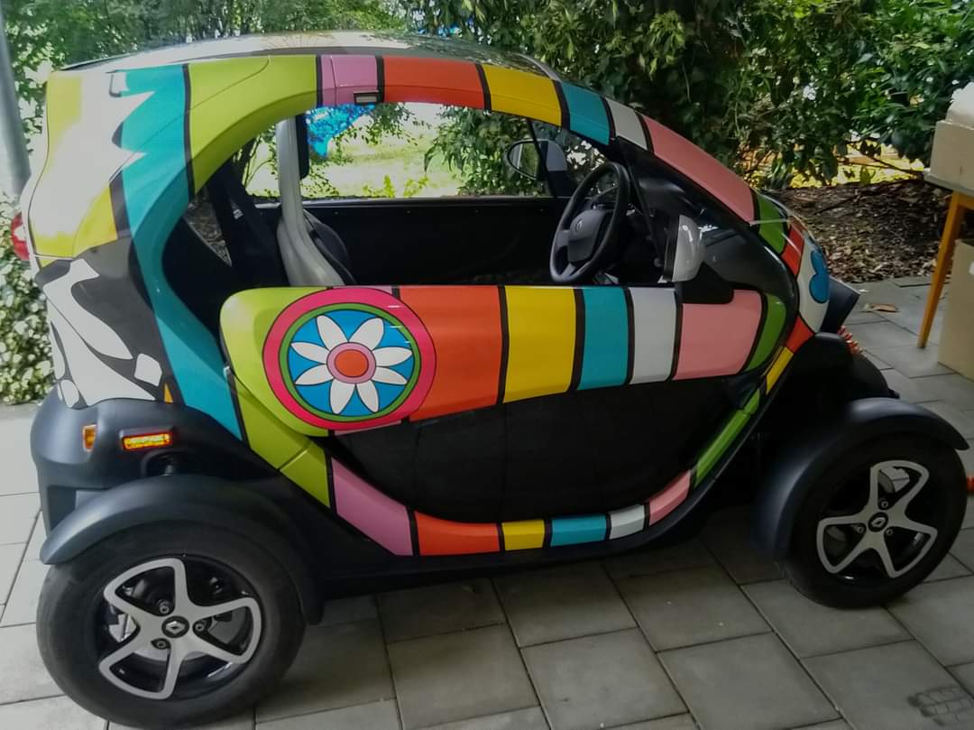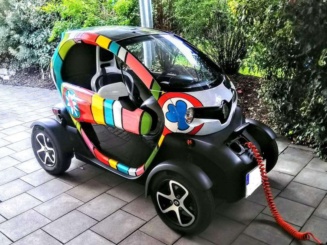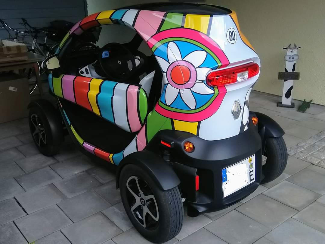 Da unser Twizy ursprünglich mal aus einer Verlosung aus Hannover stammte (wo es eine Niki de Saint Phalle-Promenade gibt), ist das (folierte) Dekor wohl ziemlich einzigartig.