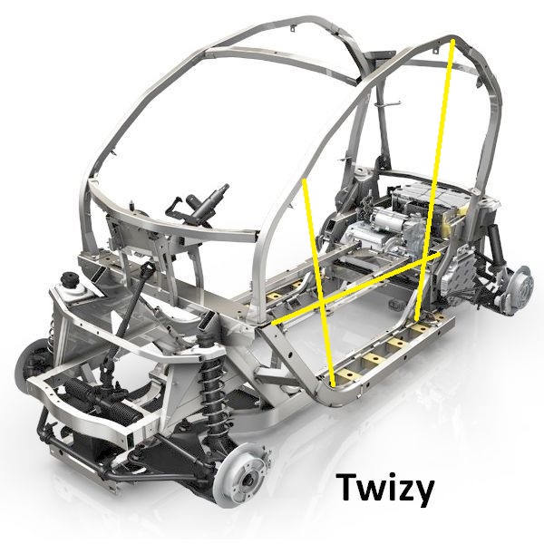 Der Rahmen des Twizy sieht ja doch recht übersichtlich aus und bietet einige Angriffspunkte für mögliche Verstärkungen, besonders wenn man Schweller einziehen will.