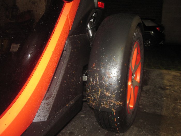 Auf dem einen Bild sieht man die "Einschlagstelle" des Drecks. Wesentlich tiefer als vorher. In dem Rahmendreieck im Bereich Kopf vom Mitfahrer war nichts.