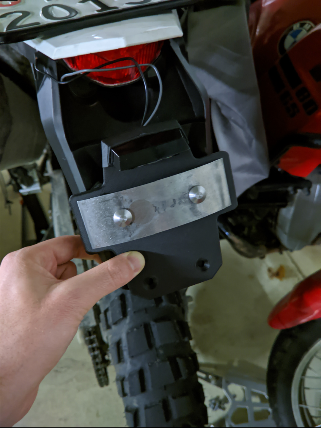Damit habe ich auch schon eine Trägerplatte für ein Wechselkennzeichen für mein Motorrad gedruckt. Dort ist eine Blattfeder und zwei Zapfen. Auf die Zapfen wird das Kennzeichen befestigt.