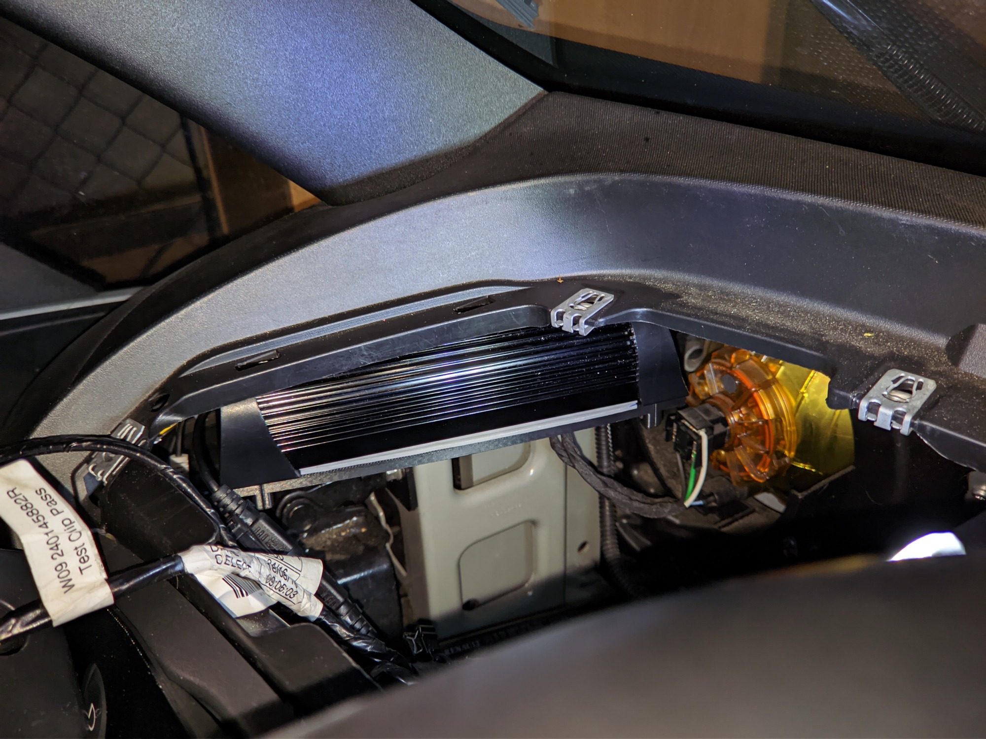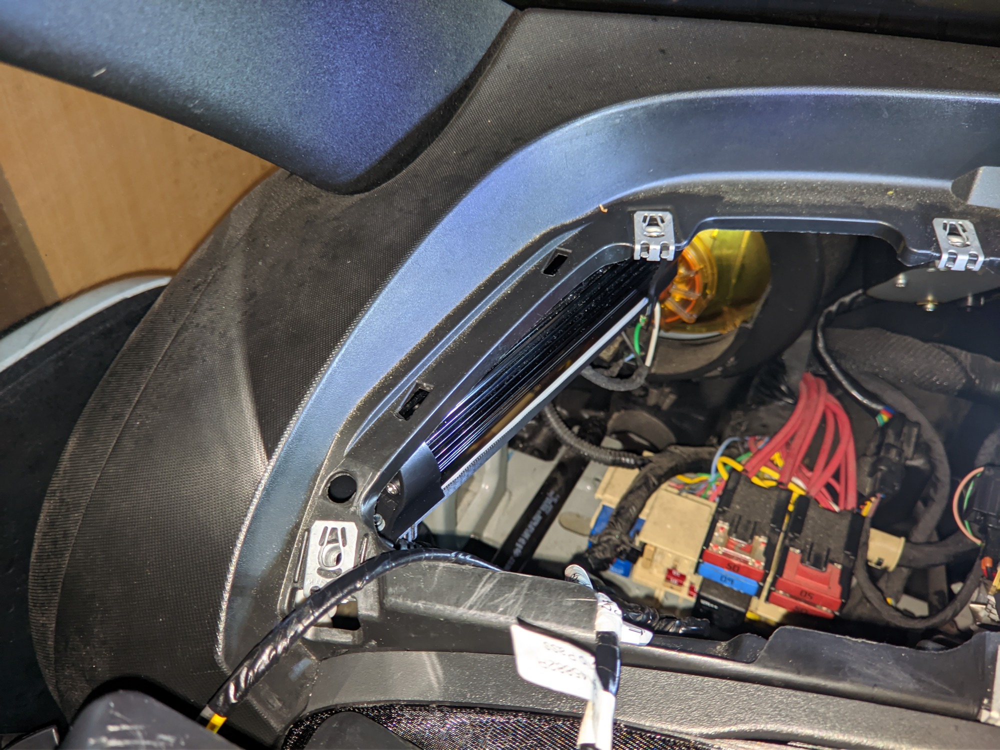 Nun habe ich die fünfte Version vom Halter für den Verstärker verbaut. Er passt genau neben dem linken Handschuhfach rein. Schalterblende ist auch montiert und ich habe auch die Kabel sauber verlegt.
