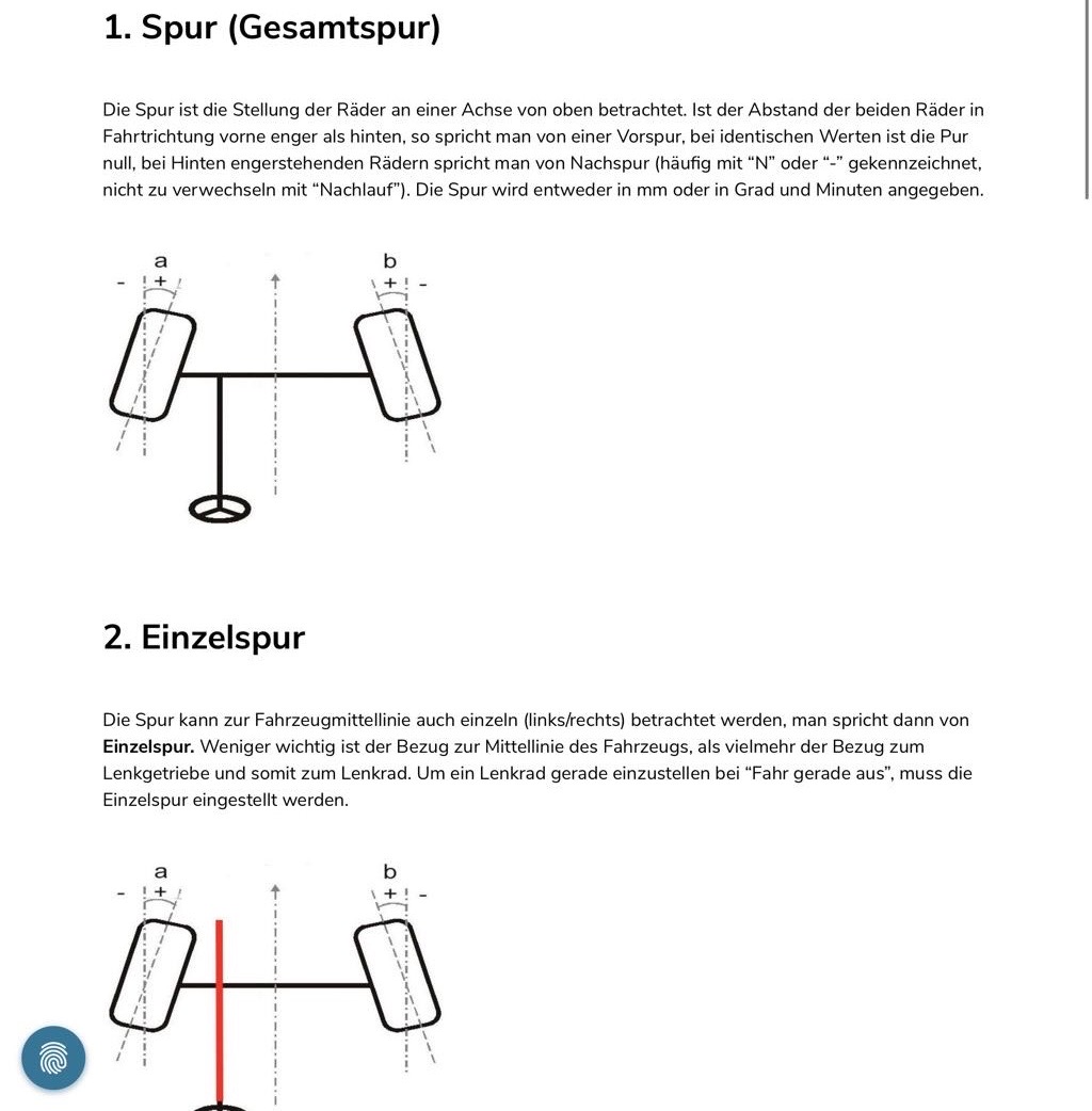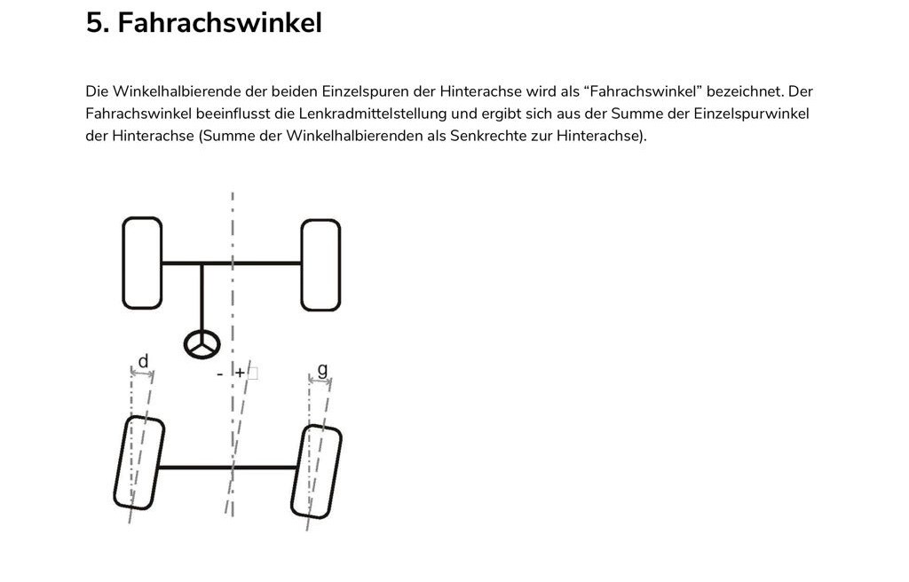und daraus den Winkel je Rad bezogen auf die Fahrzeug Längsachse ermitteln / einstellen. Damit kann man locker einen ganzen Tag in der Garage verbringen.