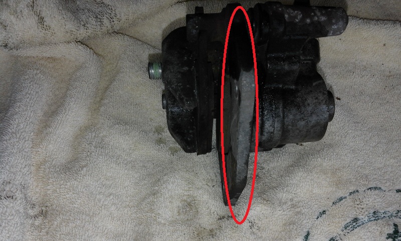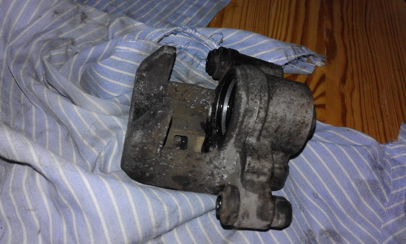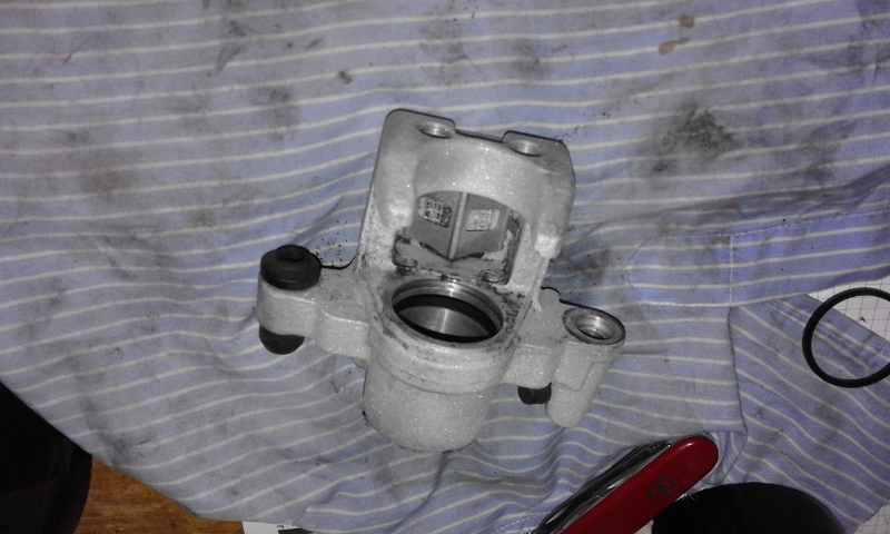 Dann müßt ihr die Halteplatte mit den Führungstiften vom Sattel trennen. Diese Stifte sind die Teile die bei vielen auch schon ziemlich verpilzt sind.