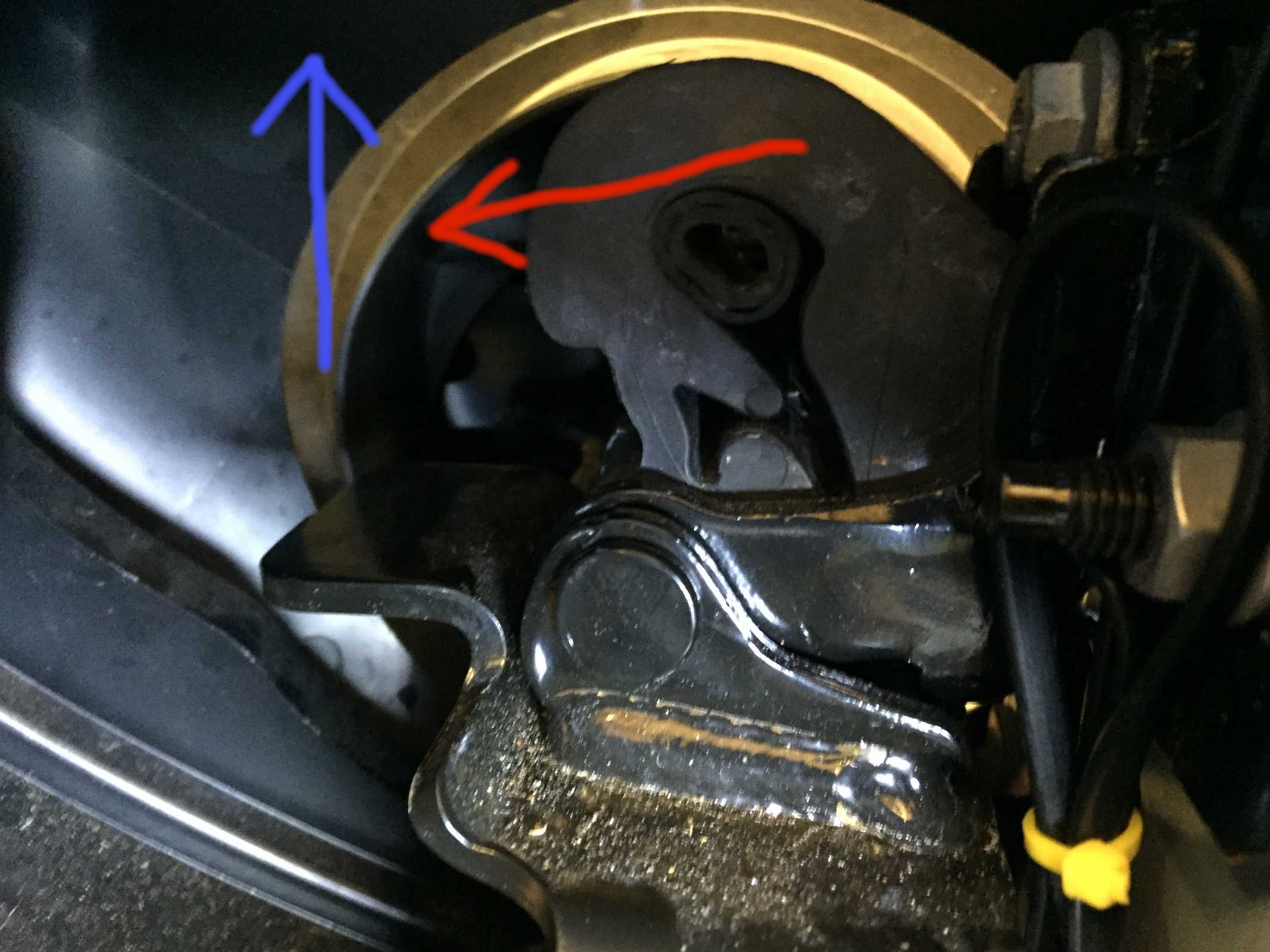 Falls ihr mit dem Bild nicht so recht klarkommt. Das was von rechts kommt, ist der Schraubenzieher, der mit der Klinge unter den Clips des von links kommenden Dämpderf geschoben ist um den Clip abzuhebeln.