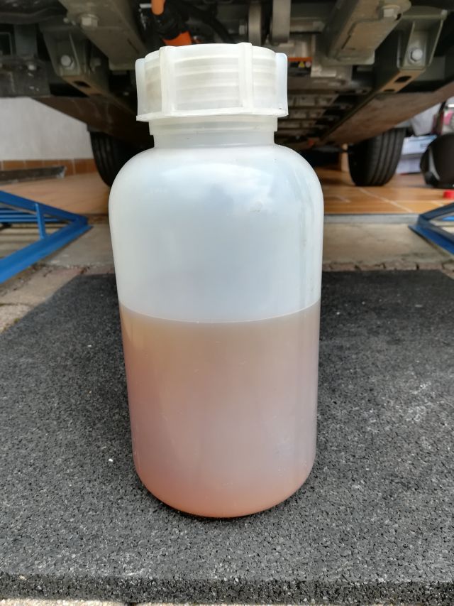 Das Altöl füllt die 1l Getriebölflasche komplett