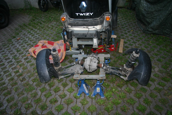 Dazu bleiben die Stoßdämfer angeschraubt, aber man entfernt die Koppelstangen und Dreieckslenker und schiebt diese zu Seite weg.Getriebe und Achsen sind nur gesteckt.