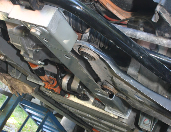 Nun kann man den Hilfrahmen vom Fahrzeug trennen, dieser ist so leicht dass man ihn geradeso mit 2 kräftigen Leuten wegtragen kann, ich habe allein mit 3 Wagenhebern und 4 Unterstellböcken gearbeitet.