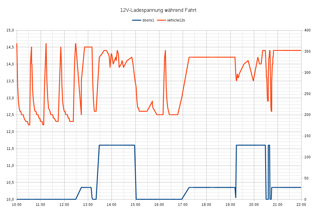 Die Spannung war auf der Hinfahrt nie unter 13,9 V und im Schnitt eher bei 14,2. Die Rückfahrt startete (direkt nach der Ladung) mit 13,5 V, ging aber dann auch wieder bis auf 14,4 V hoch. Die 0,4 V weniger sind vermutlich dem aktiven SEVCON (+ Licht, Navi etc.) geschuldet.