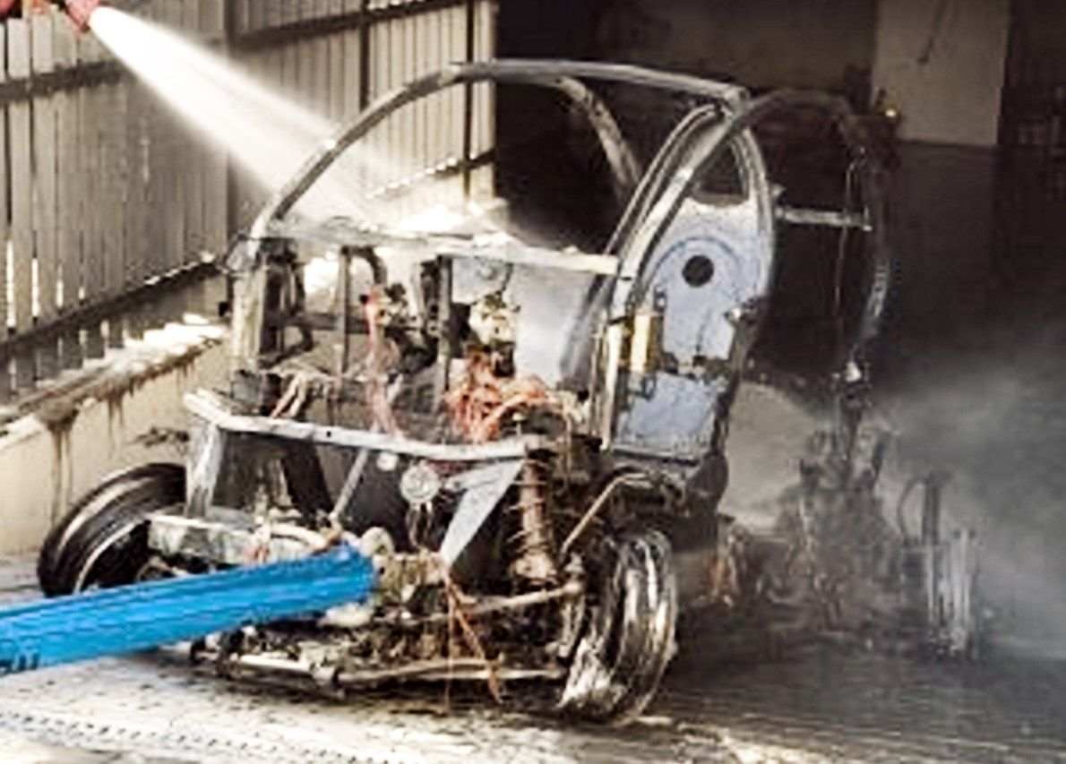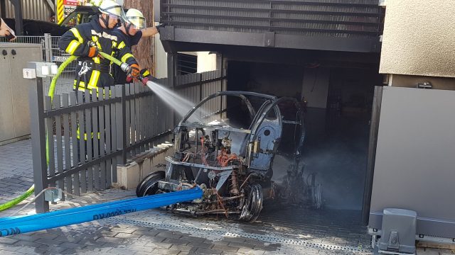Zum Endgültigen Ablöschen und Abkühlen der Batterie musste die Berufsfeuerwehr mit einem Container vorfahren, in dem der Twizy verladen wurde. Zusammen mit dem Renault wurde der Container mit Wasser geflutet, so das der Akku ohne sich immer wieder zu entzünden, abkühlen konnte.