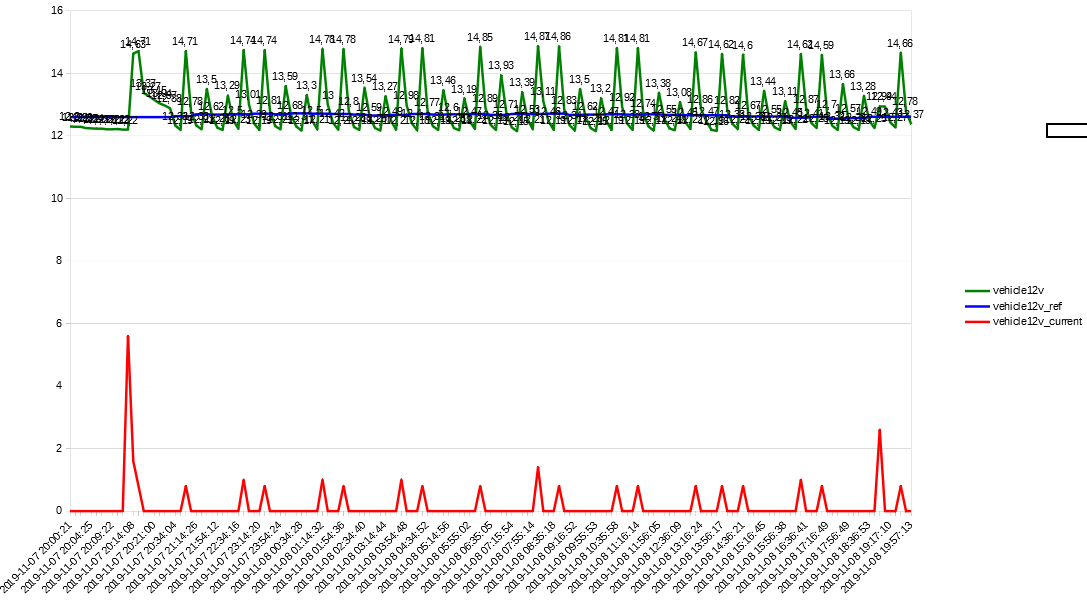 dexter schrieb: Noch eine Option mit laufendem OVMS: dass Du die 12V-Daten in der Tabelle "D" auswertest. Anhand der Spalten doors5, vehicle12v, vehicle12v_ref und vehicle12v_current kannst Du nachverfolgen zu welchen Zeiten die 12V-Batterie nachgeladen wurde, und mit welcher Stromstärke. Die Spalte tcharger zeigt Dir dazu an, ob das Ladegerät dabei ungewöhnlich warm wird.