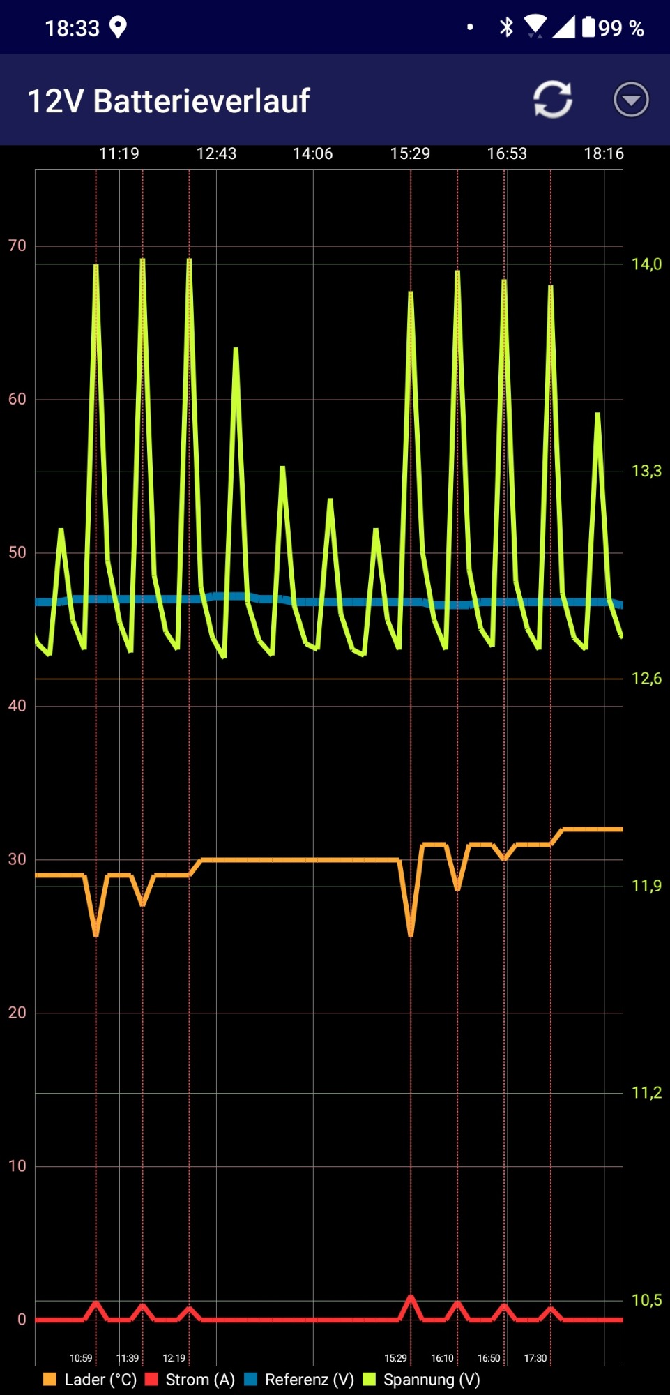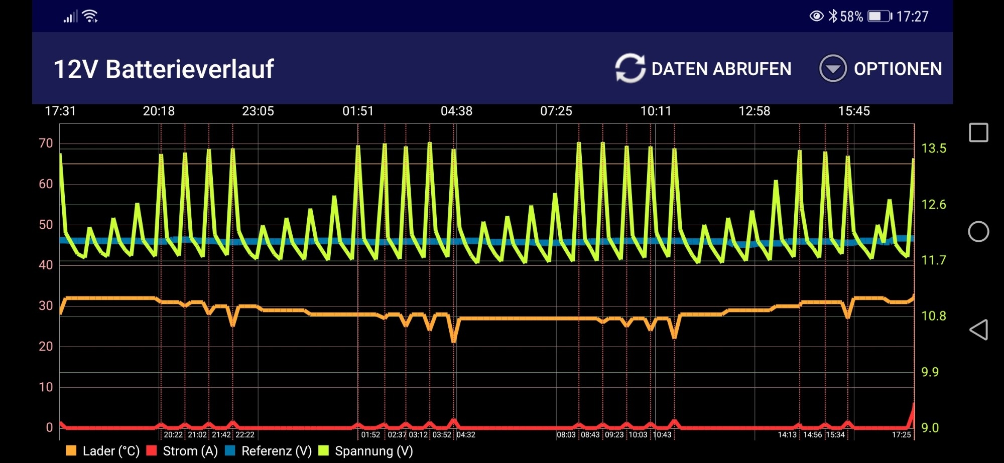 Dann wurde der Akku geladen: Meldung: "12V Battery OK (13.0V, ref=12,8V).