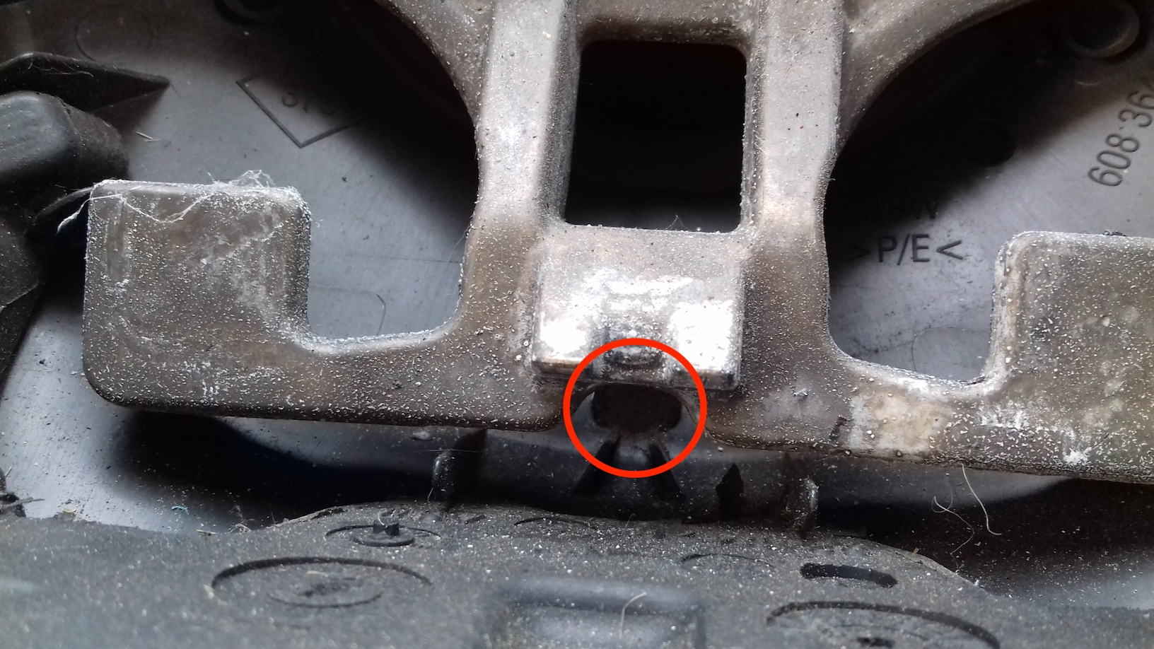 Man sieht das Runde Loch. Dort hinein muss vom Armaturenbrett/Tacho aus ein Werkzeug geschoben werden, welches das Federblech vom Airbag, welches normalerweise über den Nasen des Lenkradchassis sitzt, in richtung des Photographen drückt.