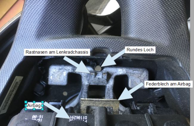 Diese Zunge. Die hält den Airbag fest, für das das Lenkrad das passende Gegenstück hat.