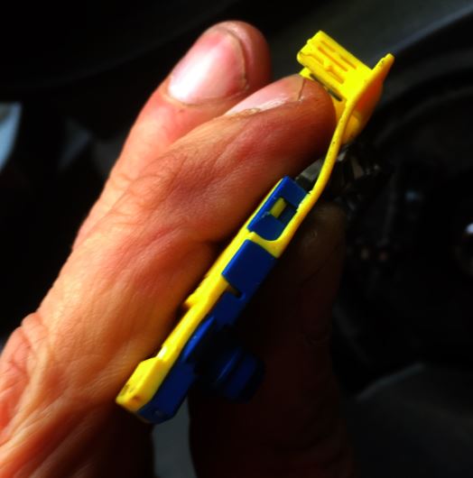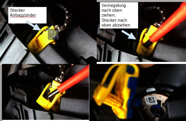 Die Sicherung des steckers muss man wie im Bild unten nach hinten biegen, um den Stecker durch die Öffnung im Lenkradchassis zu friemeln, passt sonst nicht durch.