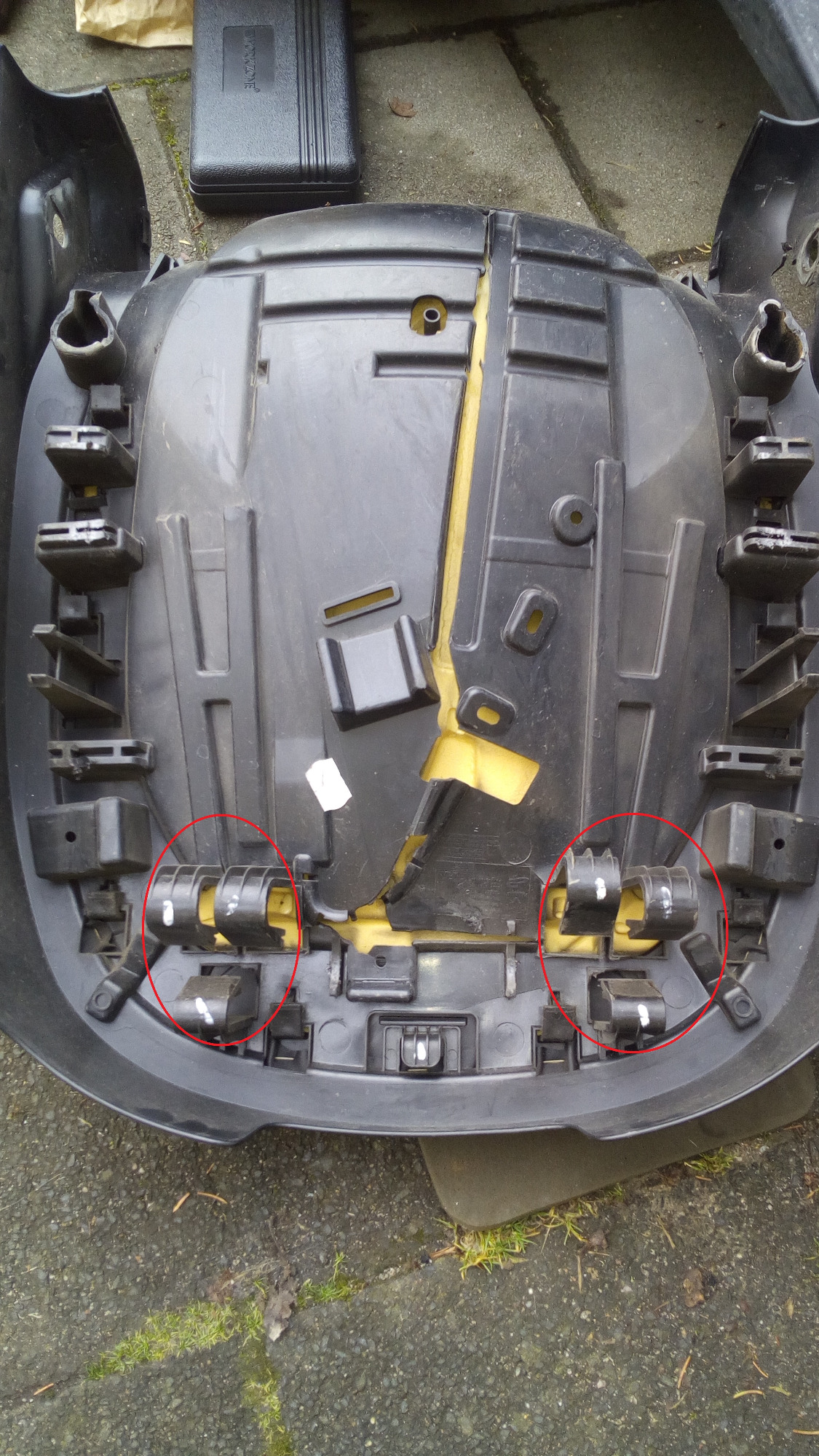 Das Polster ist vorne nur geklemmt. Rot markiert.