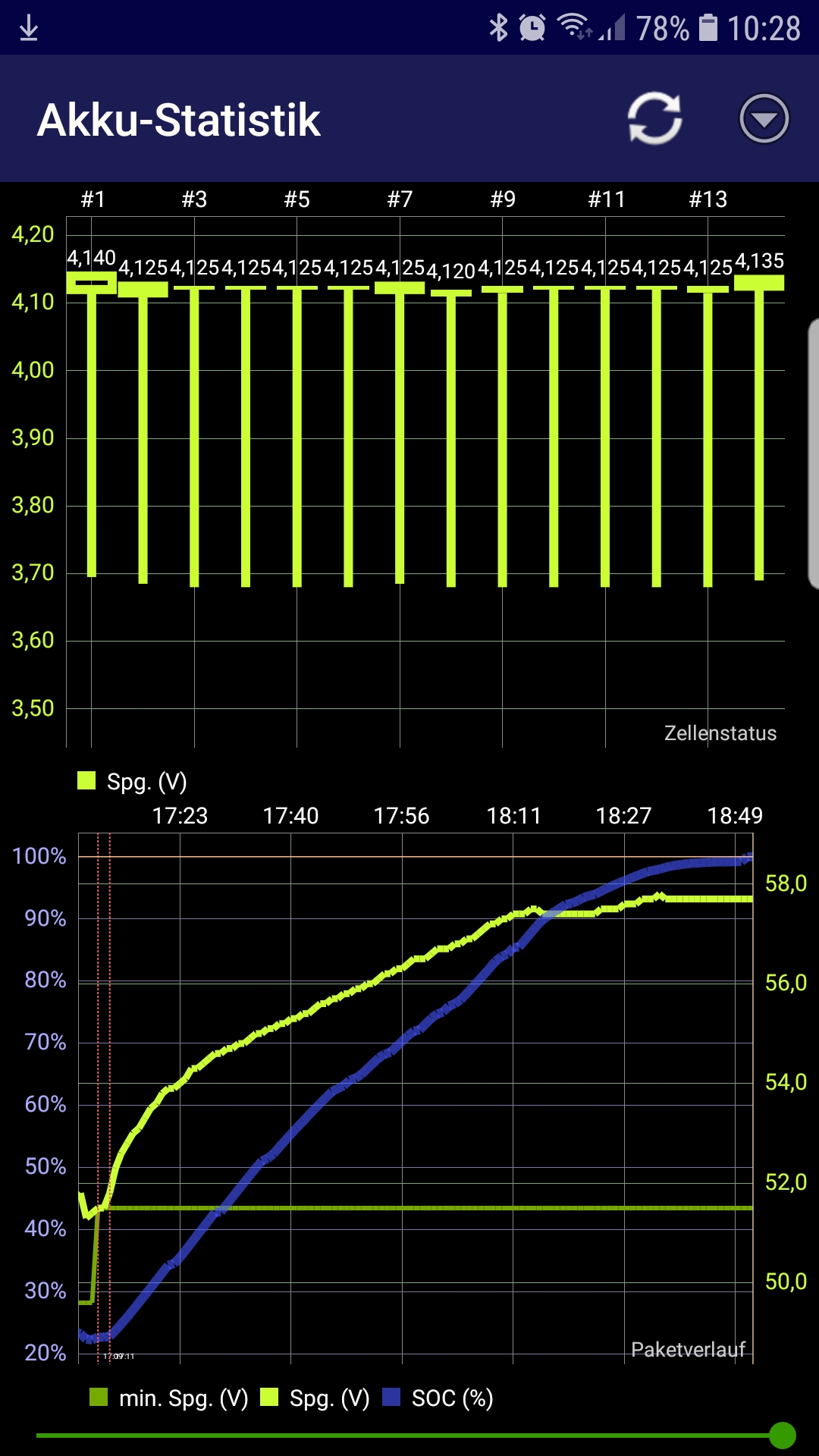 Man sieht schön, dass der externe Lader kurz nach 18:11 Uhr abgeschaltet hat. Ich hatte den Lader so einstellen lassen, dass er bei 57V ausgeht (mit dem Multimeter habe ich allerdings 57,7V gemessen). Das entsprach übrigens 89% SOC.