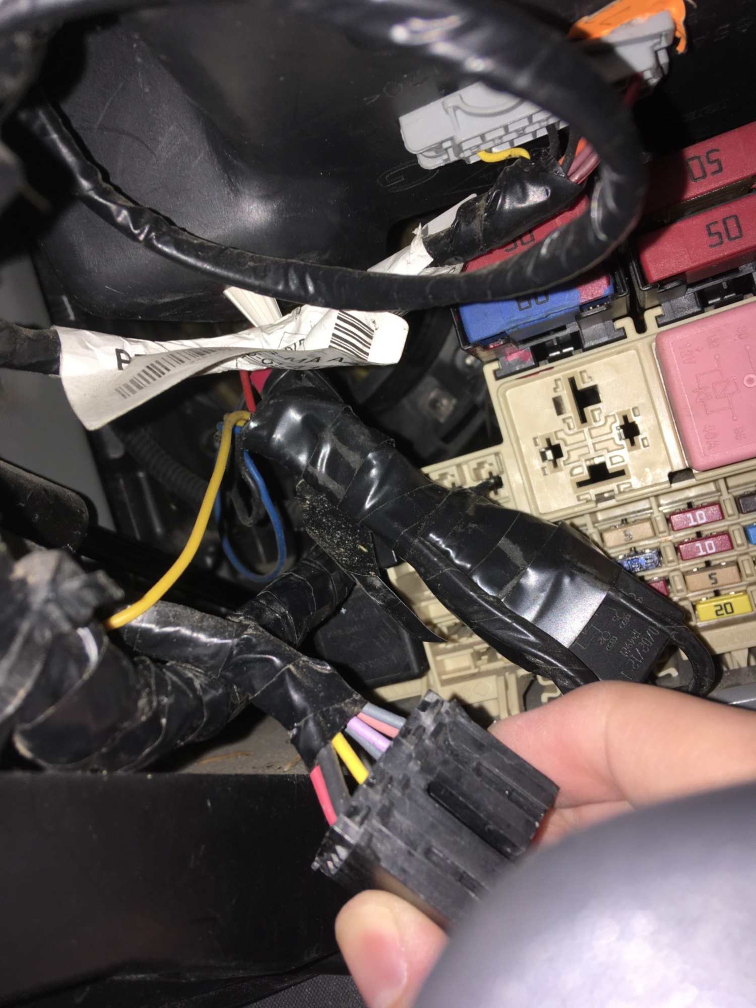 Von dem Konstrukt geht aber tatsächlich ein Kabel in Richtung Lampen (das Blaue). Außerdem scheint ein gelbes vom ISO stecker Kabelbaum zu kommen (vermutlich Dauerplus?). Und es gibt noch zwei schwarze die nach oben gehen.