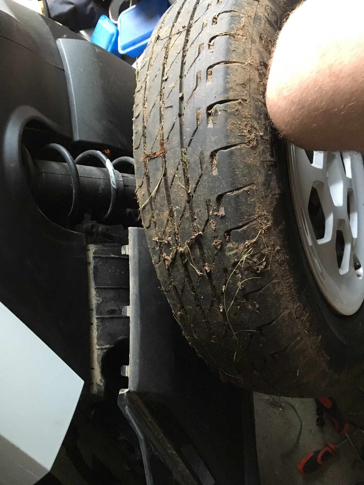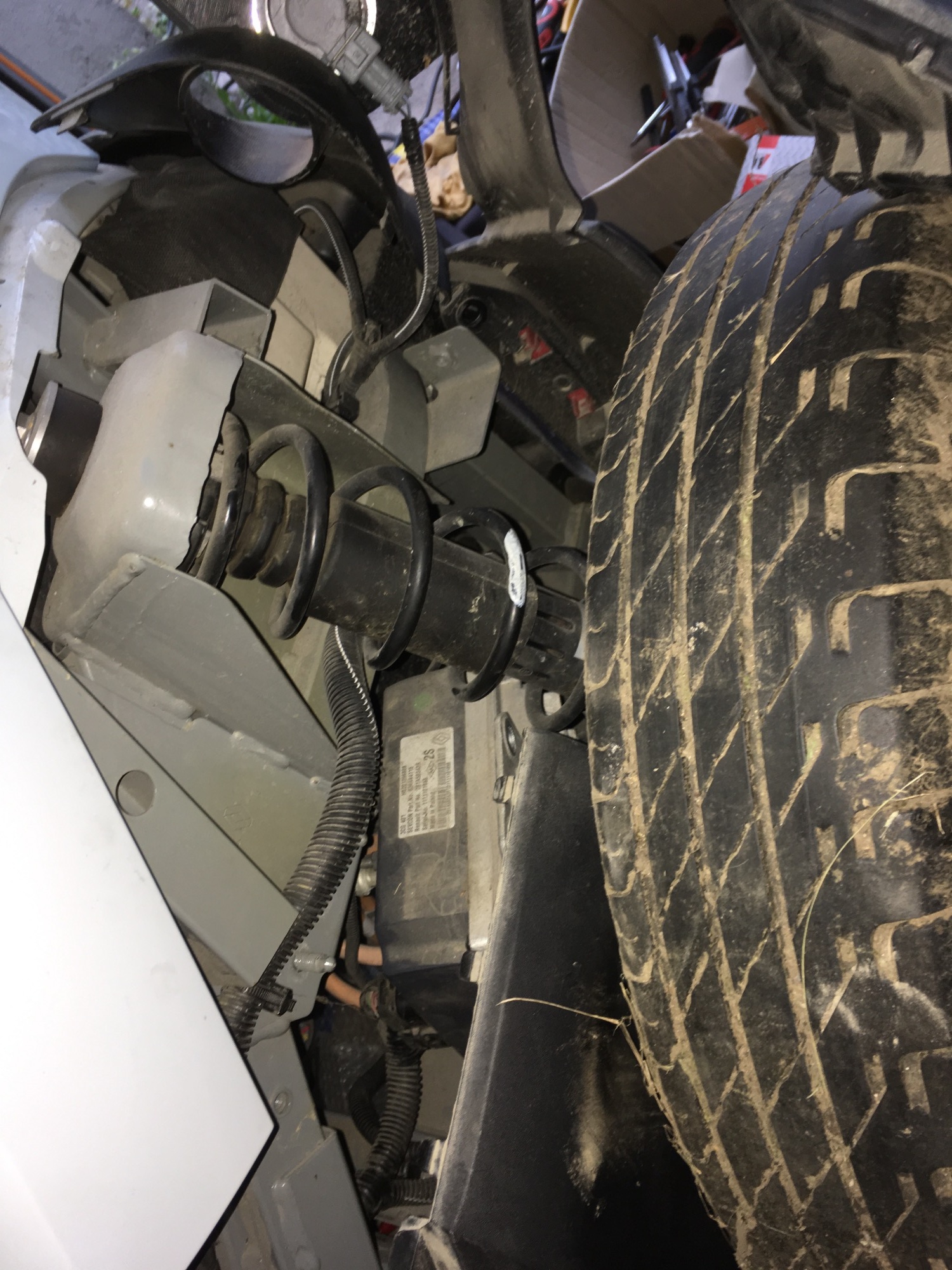 Demontage links, von der Seite. Am besten mit demontiertem linken Hinterrad etwas hochbocken (gut gesichert).