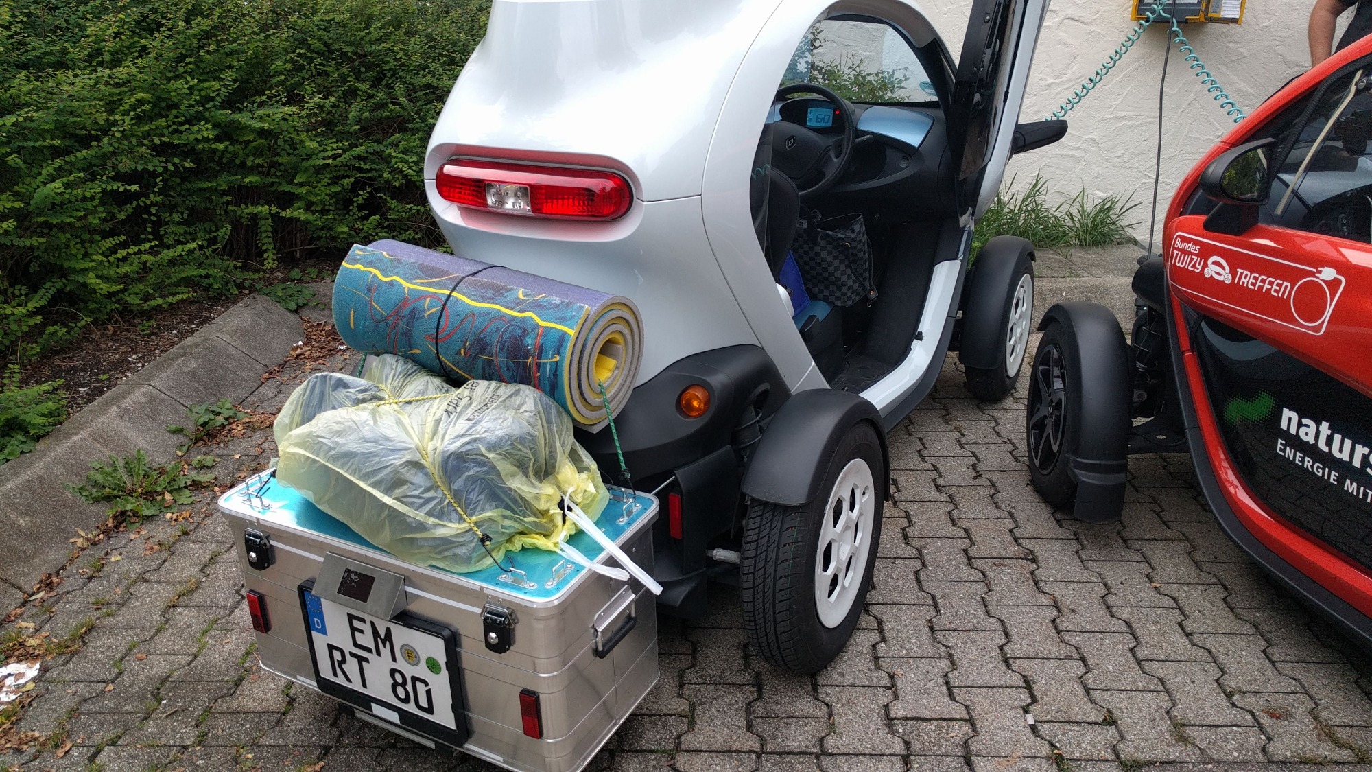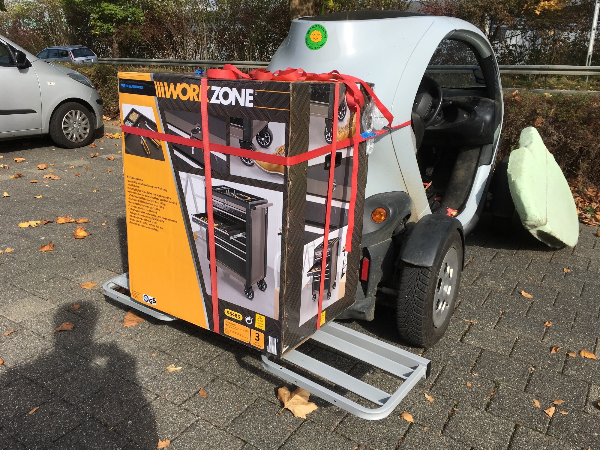 Ja das ist eine gute idee, aber klapp sachen sind glaube immer schwer vom gewicht und kompliziert herzustellen wenn sie nicht aus fragilen rohr konstruktionen bestehen. Ich werde zum nächsten we. mal ein video mit beladenem auto anhänger beim rangieren mit dem twizy einstellen, damit man sieht was die konstruktion kann.klausz schrieb: Das ist ein Fahrradträger. Wenn die 50kg nicht überschritten sind und Nummerntafel, Blinklicht etc sichtbar sind sehe ich da kein Problem. Es war ja auf einem Parkplatz