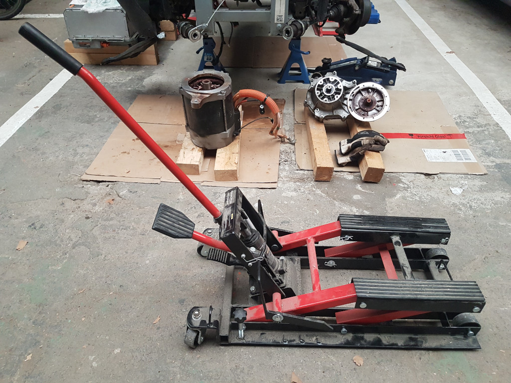Damit kann man die Batterie oder den Hilfsrahmen (inkl. Motor und Getriebe) recht leicht alleine absenken. Man kommt dann ansonsten mit zwei Auffahrrampen und zwei Unterstellböcken locker aus.