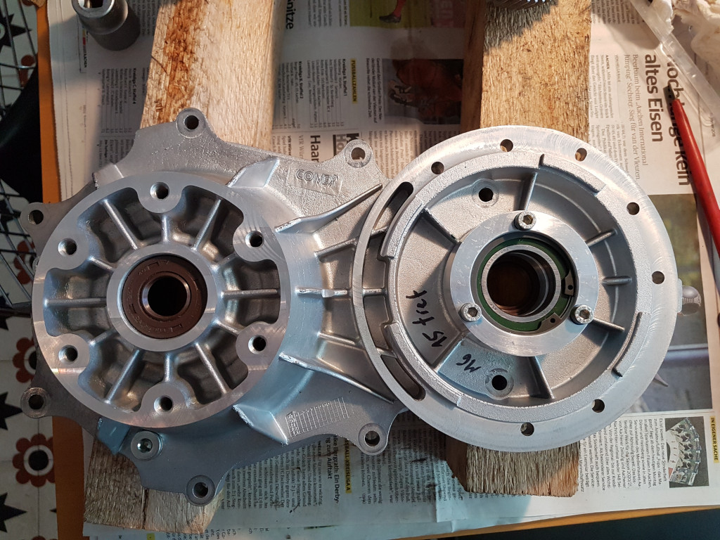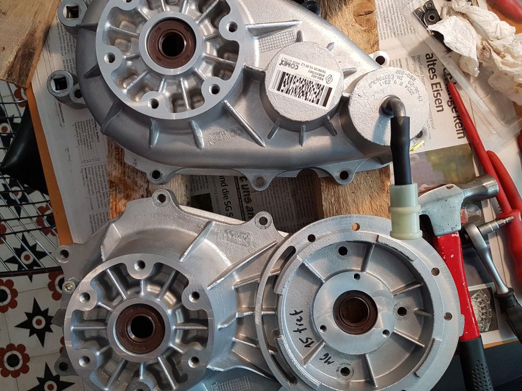Im Getriebe habe ich tatsächlich Wellendichtringe aus Viton (FPM) eingesetzt um etwas mehr Temperaturfestigkeit zu haben. An dieser Stelle ein kleiner Tipp: Der Zusatzlager-Halter ist das perfekte Einbauwerkzeug, der passt auch für die Abtriebswellen, da der Außendurchmesser gleich ist. (Aber vorsichtig sein, der ist nämlich aus Alu, und einen Holzklotz auflegen, damit man mittig schlagen kann.)