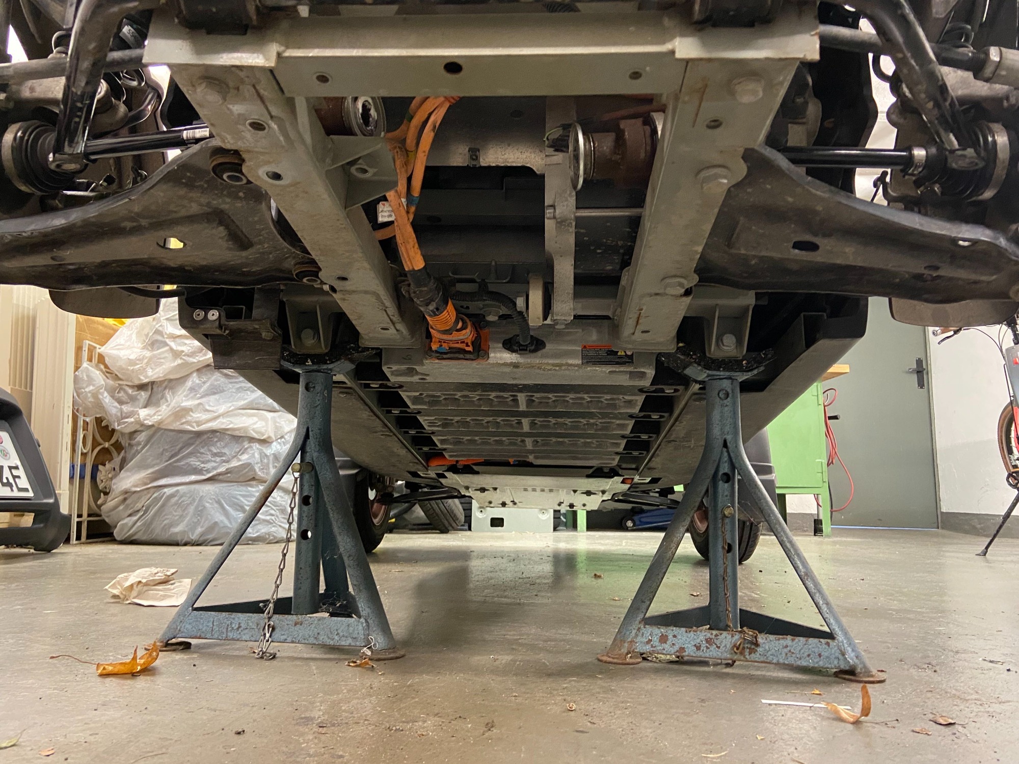 Dabei habe ich zuerst das Kunststoffheck abgebaut. Dann den Wagenheber mittig am hinteren Querrohr angesetzt und angehoben.