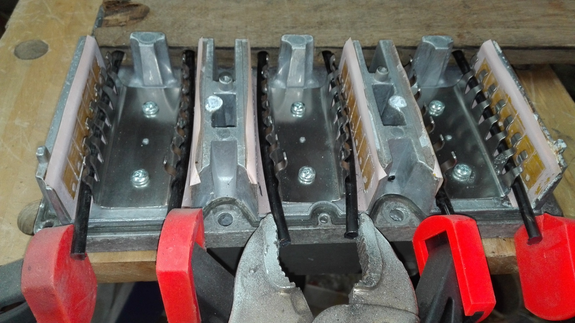 Ein Holzbrettchen Löcher positioniert, kegelförmig gemacht, die Stahlstangen vorne abgerundet und vorsichtig hineingeklopft, dann zusammengeklemmt.