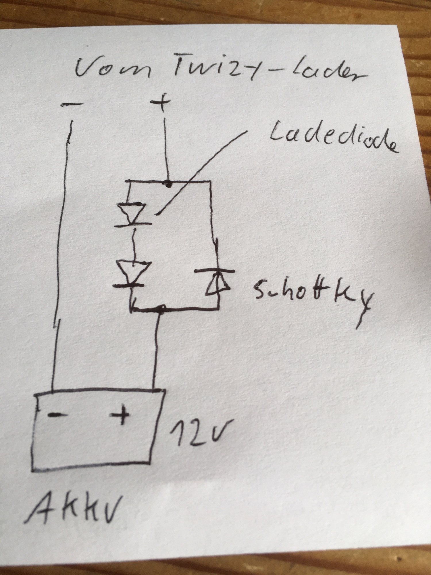 Zweite Idee: Antiparallele Dioden reinschleifen. In Laderichtung müsste man messen, auf wieviel Volt die Spannung denn wirklich steigt. Schaltet man da nun eine Diode in Reihe rein, nimmt diese (Wenn es keine Schottky-Diode ist) ca 0,6-0,7 V weg. Natürlich muss die den Ladestrom aushalten und die Leistung (O,7 V x Ladestrom) Ähnlich habe ich einem E-Bike-Ladegerät beigebracht, sich etwas zu zügeln. Paralell zu dieser/diesen Dioden in Verbrauchsrichtung auf Durchlass geschaltete Schottky-Diode (weil wenig verlustspannung), damit dei Batterie den Twizy versorgen kann.