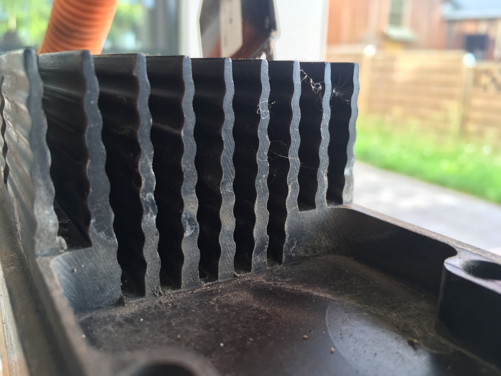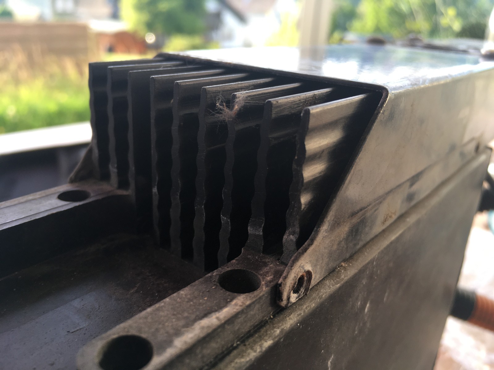 Detailbild der Luftleitung und des Einlasses. Der Dreck zeigt schön, wo die Luft in die Kühlrippen gepustet wird.