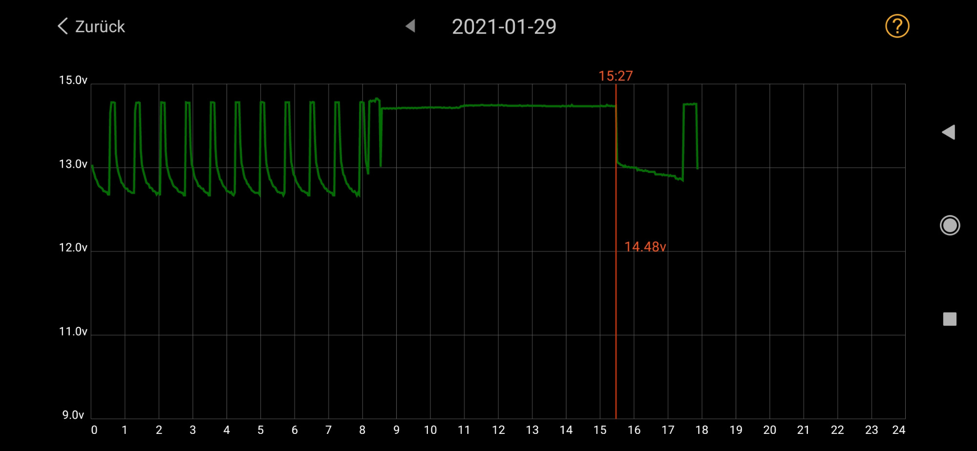 Nebenbei...bei den neuen Ladegeräten, die regelmäßig die 12 V Batterie nachladen, ist das bei der geringen Stromaufnahme wohl egal. Erstens wird beim eigentlichen Ladevorgang die 12 V Batterie dauerhaft mit geladen, bis der eigentliche Ladevorgang des großen Akkus beendet ist. Zweitens: Im Anschluss wird, obwohl die Ladung der Hauptbatterie schon lange beendet ist, anscheinend die 12 V Batterie weiter mit Stom gefüttert und bei Laune gehalten. Vermutlich weil wohl bei mir weiterhin eine ausreichende Last durch die Zusatzlüfter anliegt. Das legt zumindest mein Ladeprotokoll von heute nahe. Ich hatte den neuen Ventilator nun direkt (mit Sicherung) an die 12 V Batterie angeschlossen.