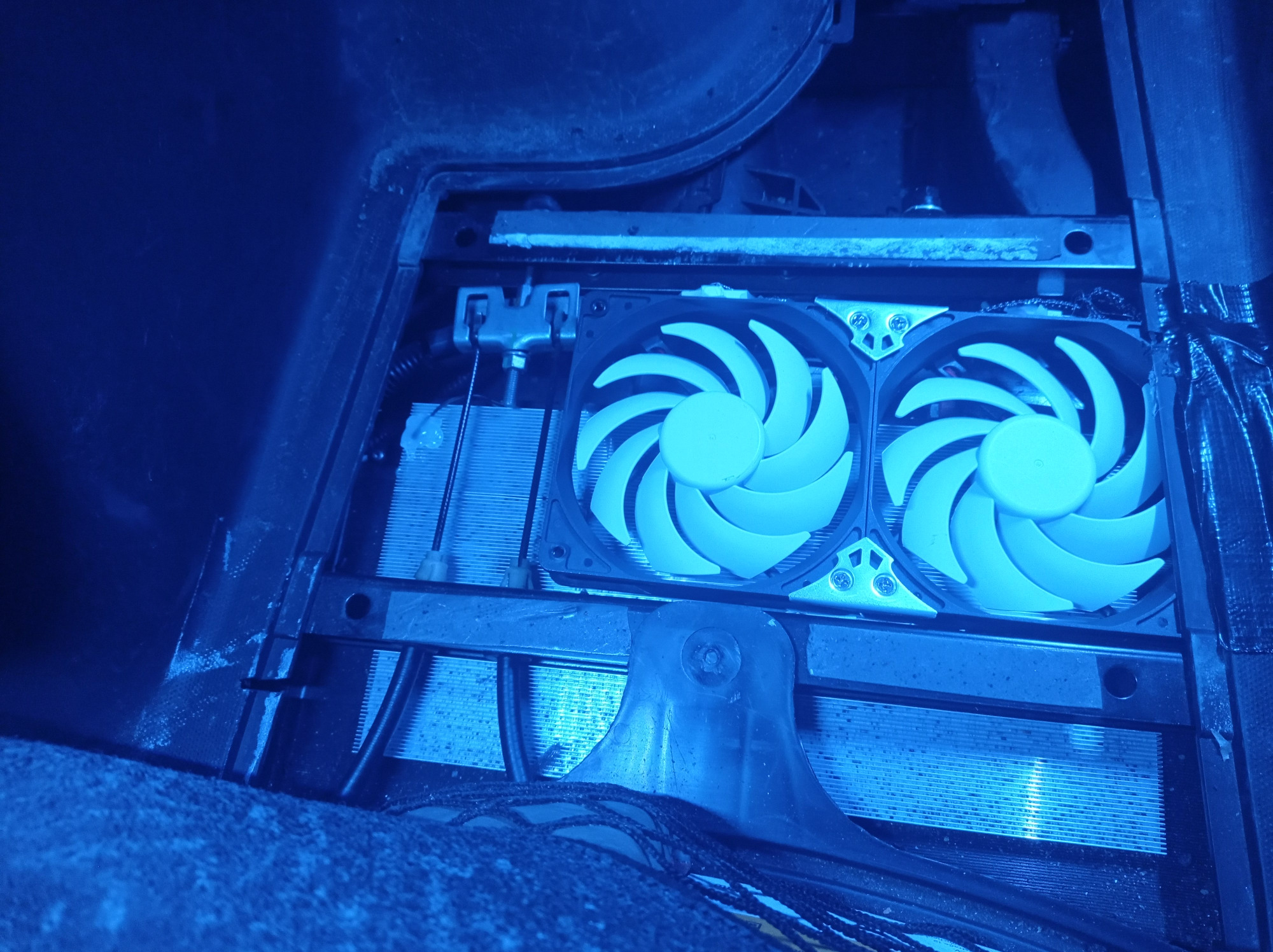 Zugegeben, warme Luft steigt nach oben. Also ist ja eigentlich die Dreh und Belüftungsrichtung falsch. Ich müsste Luft von unten ansaugen und nach oben ausblasen. Mit den kleineren 92er Lüftern müsste das übrigens gehen. Die beiden Lüfter sind nur mit kleinen Blechen zusammengeschraubt, lassen sich trennen. Auch die Kabellänge reicht aus um beide getrennt zu montieren. Ein kleiner im Bodenblech, ein kleiner im Fußbodenblech der raus bläßt.So würde die Abwärme des Laders wohl am besten nach Außen abgeführt. Ich hatte mich mit den großen 120ern etwas mit den Einbaumaßen verschätzt