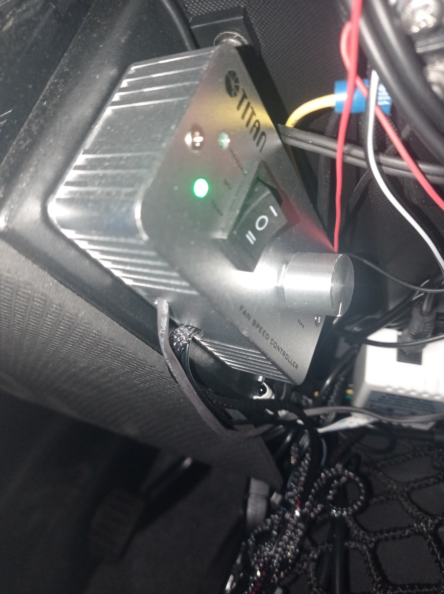 Der Fühler ist an den von mir verbauten Aluminium-Kühlkörpern ganz links mit Heißkleber fixiert. Die Steuerung hängt bei mir neben der Radiokonsole.