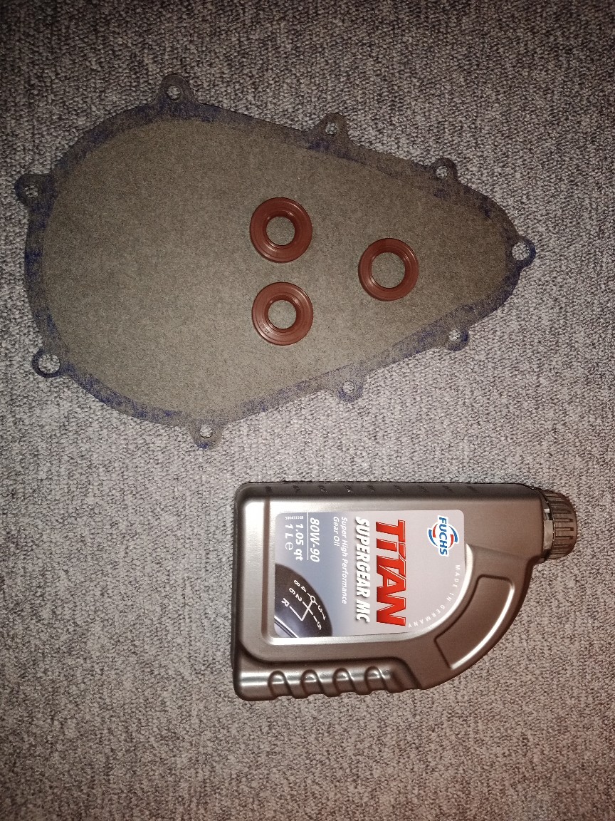 Der Dichtsatz beinhaltet neben den 3 Wellendichtringen (2x Abtriebswelle, 1x Eingangswelle) aus temperaturbeständigerem Viton (braun) eine "handgeschnitzte" Papierdichtung aus Elkring-Dichtpapier die auch wirklich passt (alle Dichtungen wurden auf meinem originalen Getriebegehäuse geprüft und ggf. nachgearbeitet) sowie bei Bedarf 1 Liter Fuchs Titan Supergear MC GL4/5 in 80W-90.