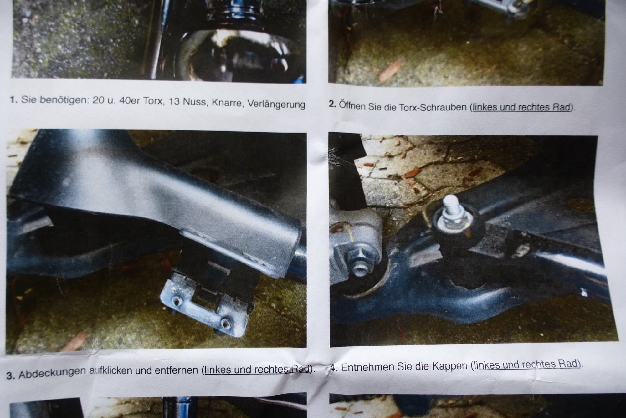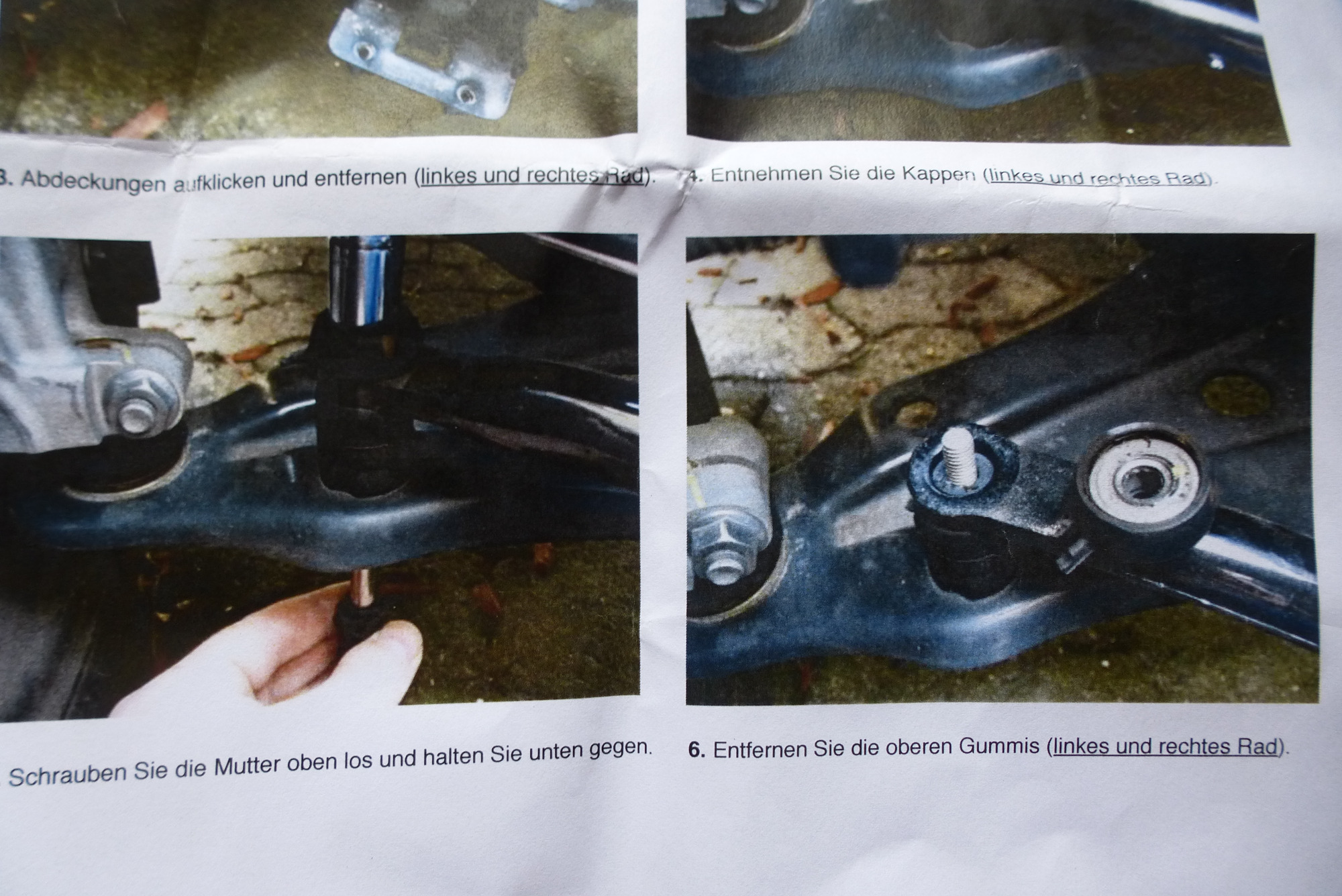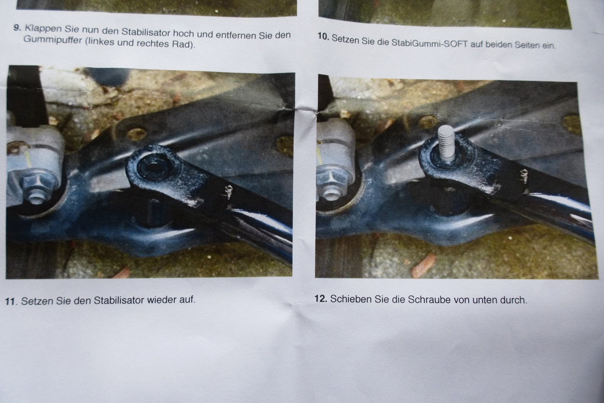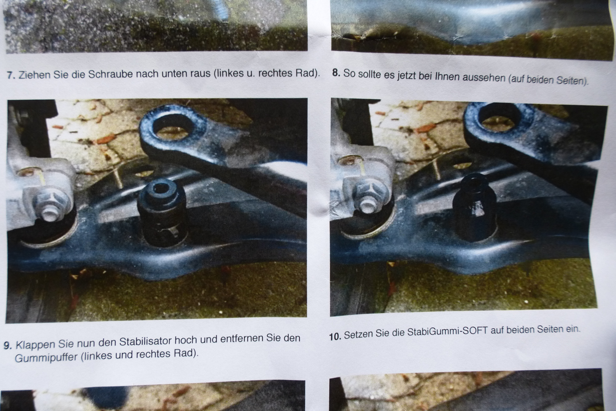 Hallo, ich habe jetzt schon viel über die Stabigummis von Ministromer gelesen und überlege, diese zu bestellen. Einbauanleitung soll ja bei der Bestellung mitgeliefert werden. Da ich aber gerne mal sehen würde, wie und wo der Einbau von statten geht, (man findet nix im Netz und auch keine Videos) wollte ich mal hier nachhören, ob einer die Anleitung noch hat, oder mir kurz erklären, ob ich das als durchschnittlich begabter Schrauber ohne Probleme schaffe, diese auszutauschen…